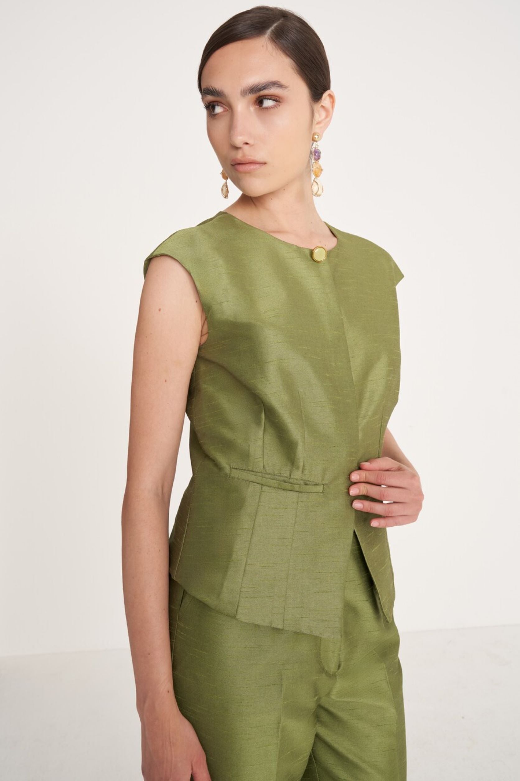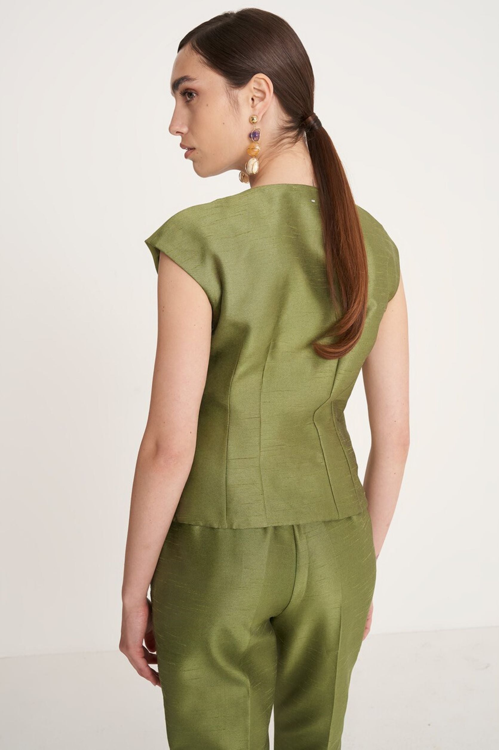 Cathryn é uma camisa requintada confecionada em tecido shantung, com decote redondo, abertura frontal com botões forrados e mangas curtas. O seu design clean e elegante combina perfeitamente com as calças Pedro a condizer, para um look sofisticado e contemporâneo — ideal para ocasiões formais de outono.