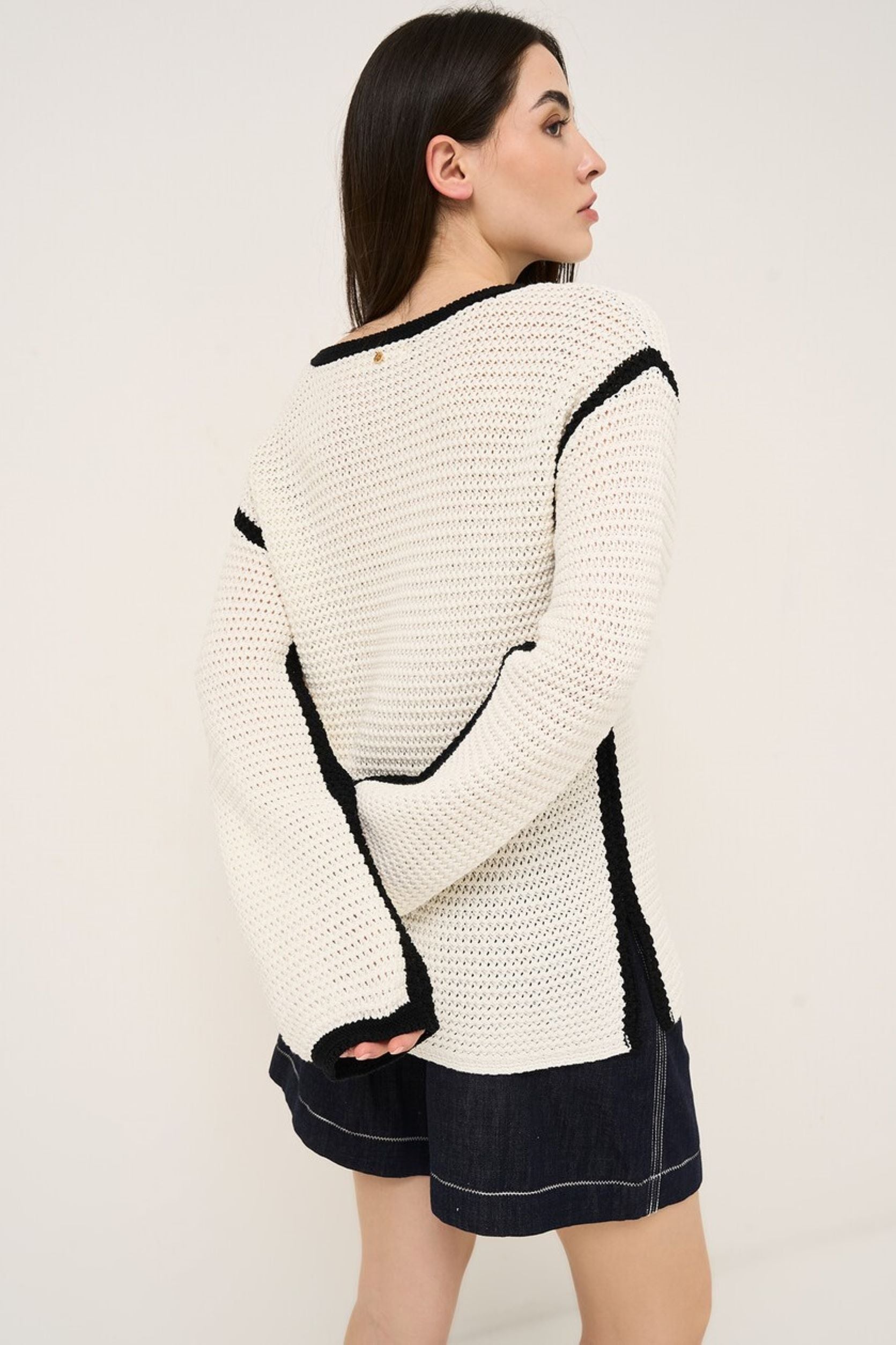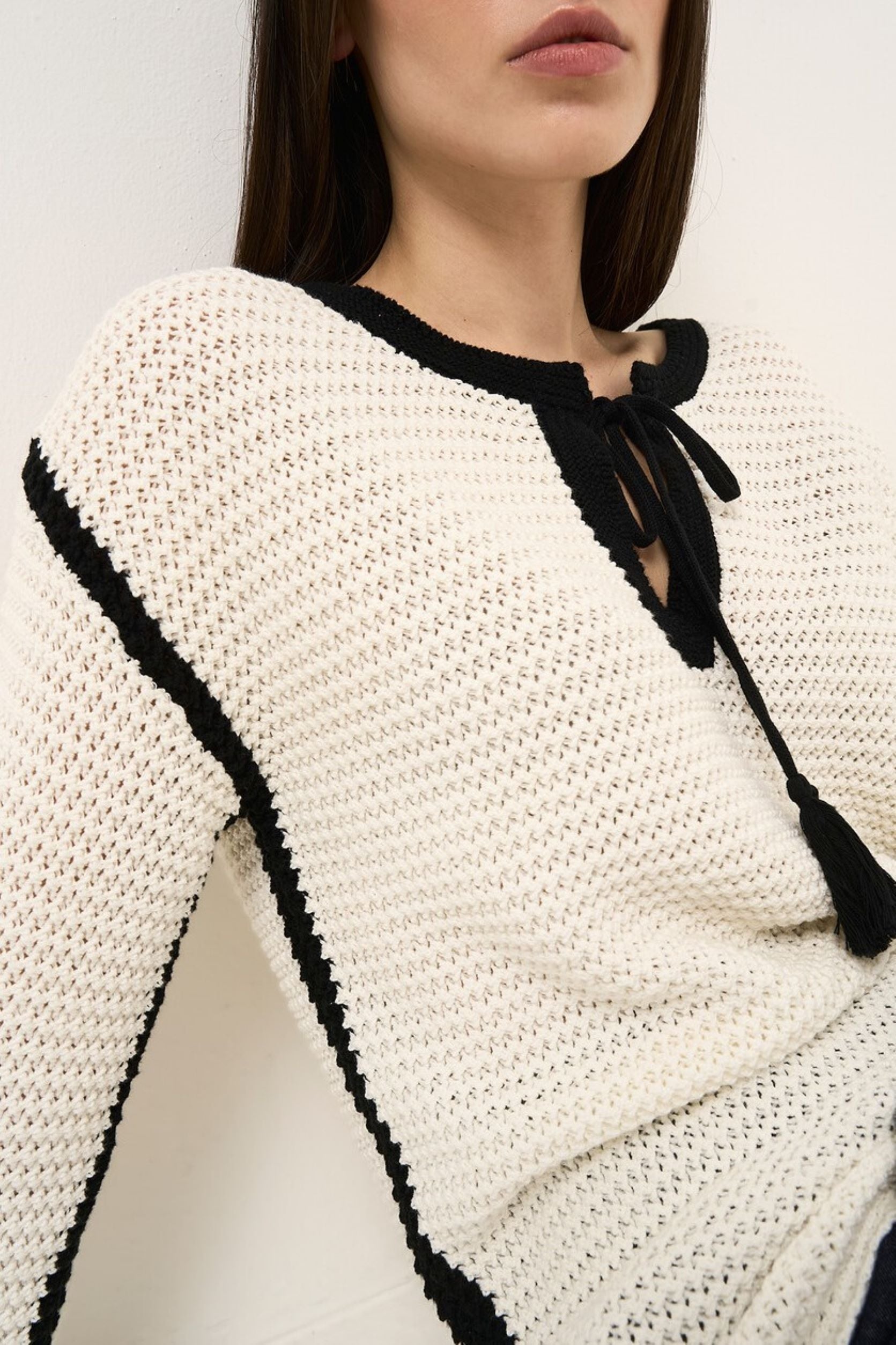 A camisola Marcella é uma peça com um charme vintage, mas não excessivo, perfeita para quem procura um estilo boémio contemporâneo. Confecionada em algodão puro, destaca-se pelo elegante decote em gota, que pode ser fechado com um cordão adornado com graciosas borlas. O design é enriquecido por mangas compridas ligeiramente largas e aberturas laterais que conferem fluidez e movimento à silhueta. Para um look fresco e original, é perfeita para combinar com um par de calções e sapatos baixos, criando um equilíbrio ideal entre elegância e conforto para a estação da primavera. A modelo tem 1.75 M de altura e veste o tamanho S.