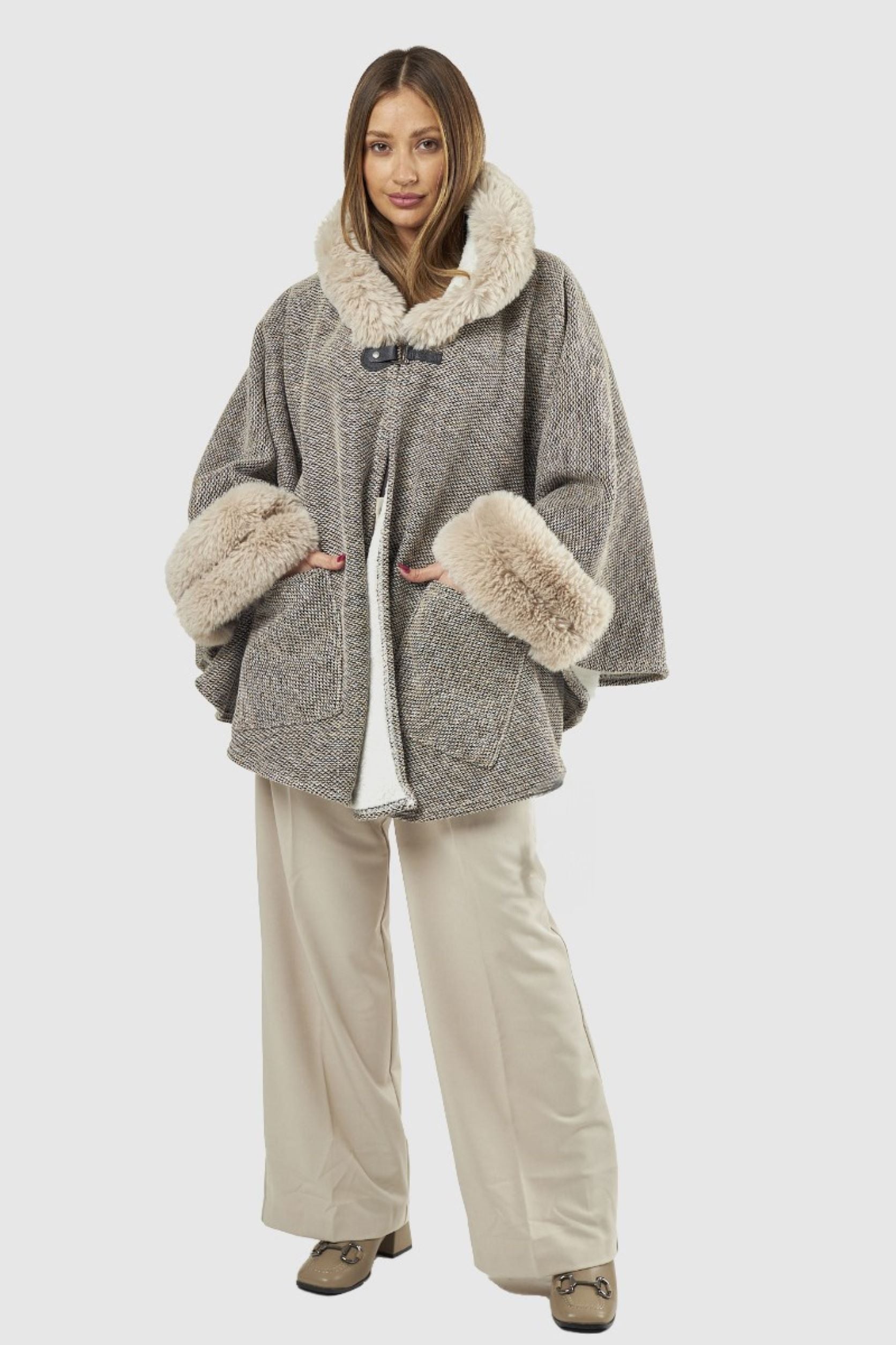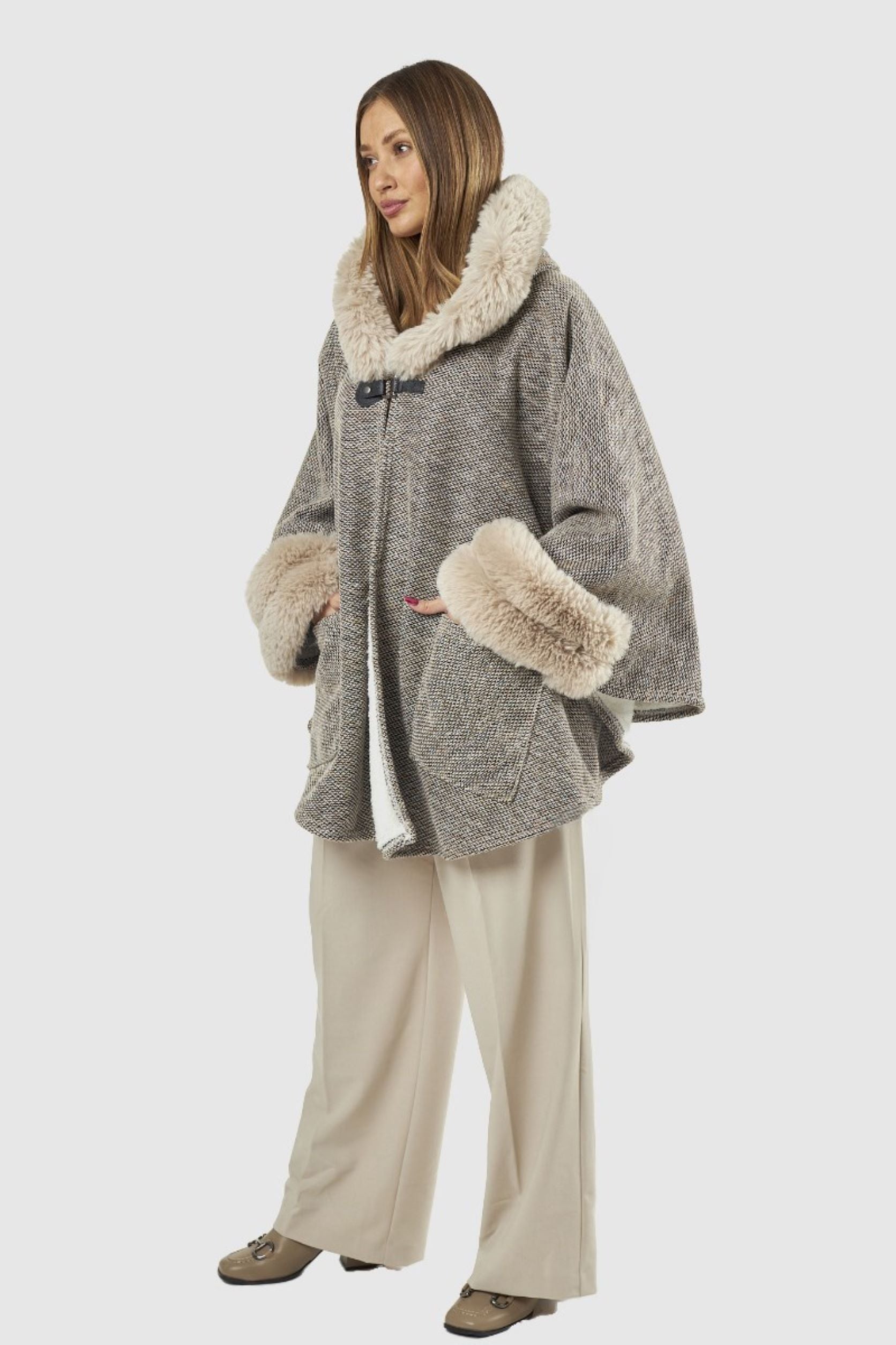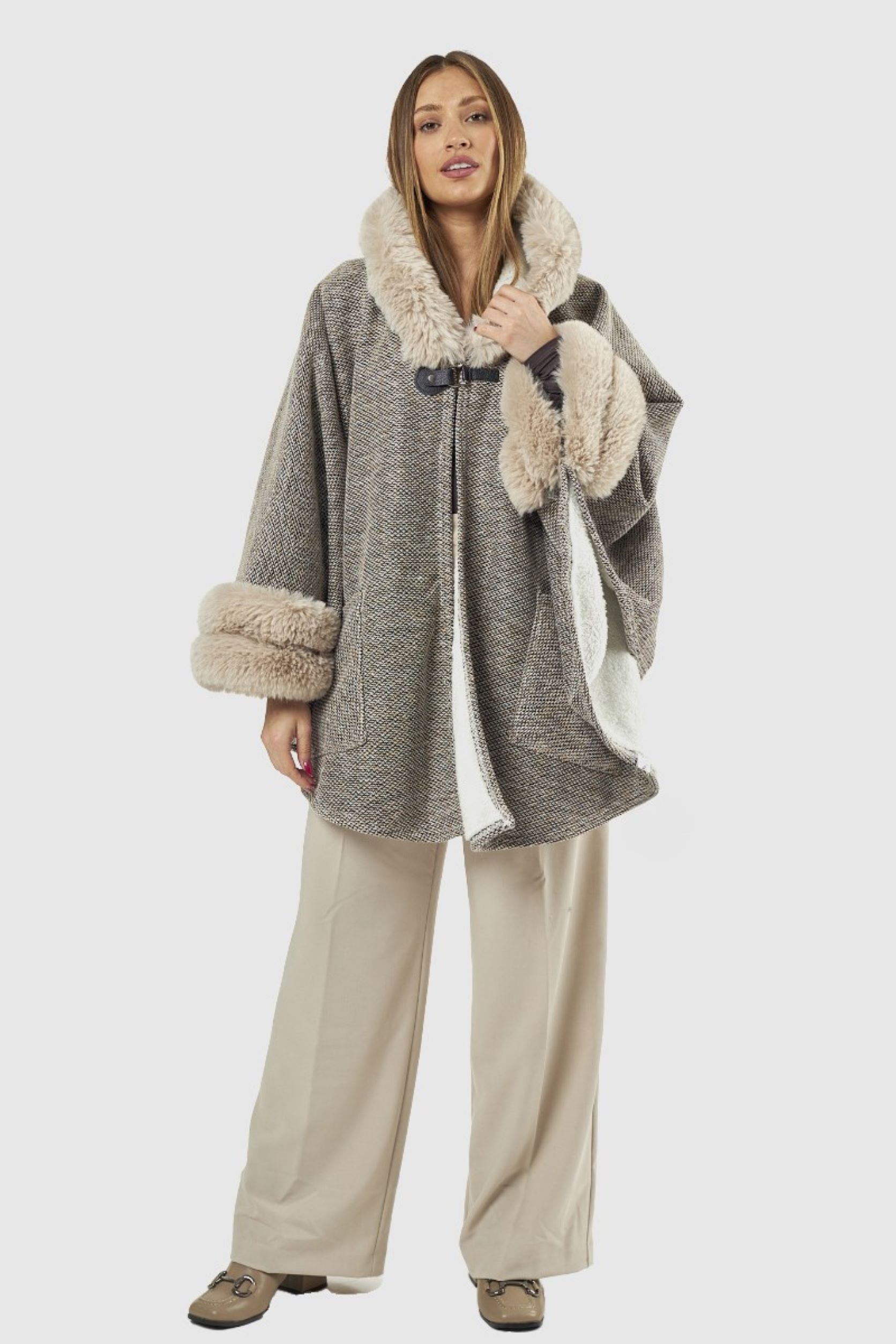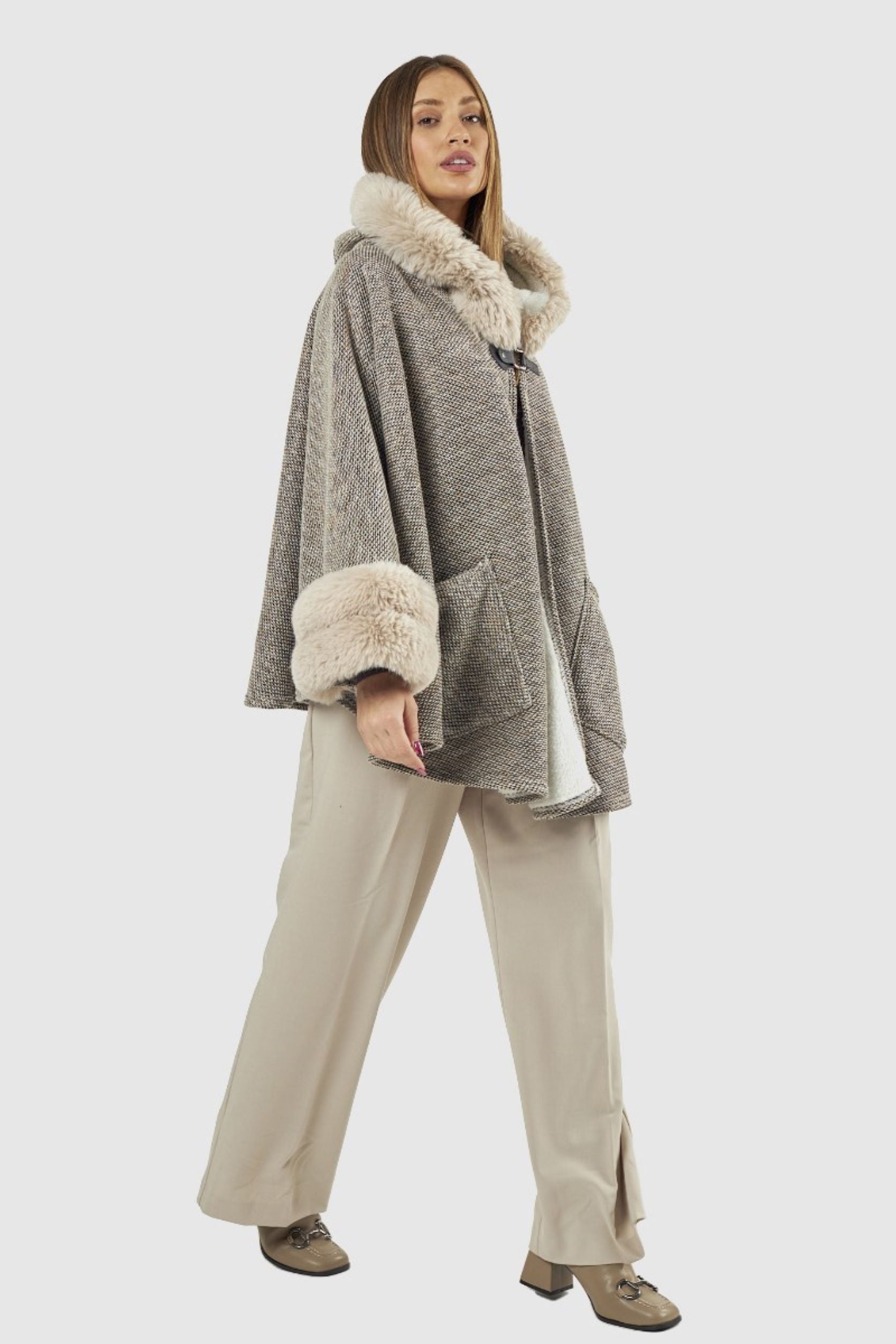 Capa com pêlo na gola e nas mangas, fecho na parte da frente.