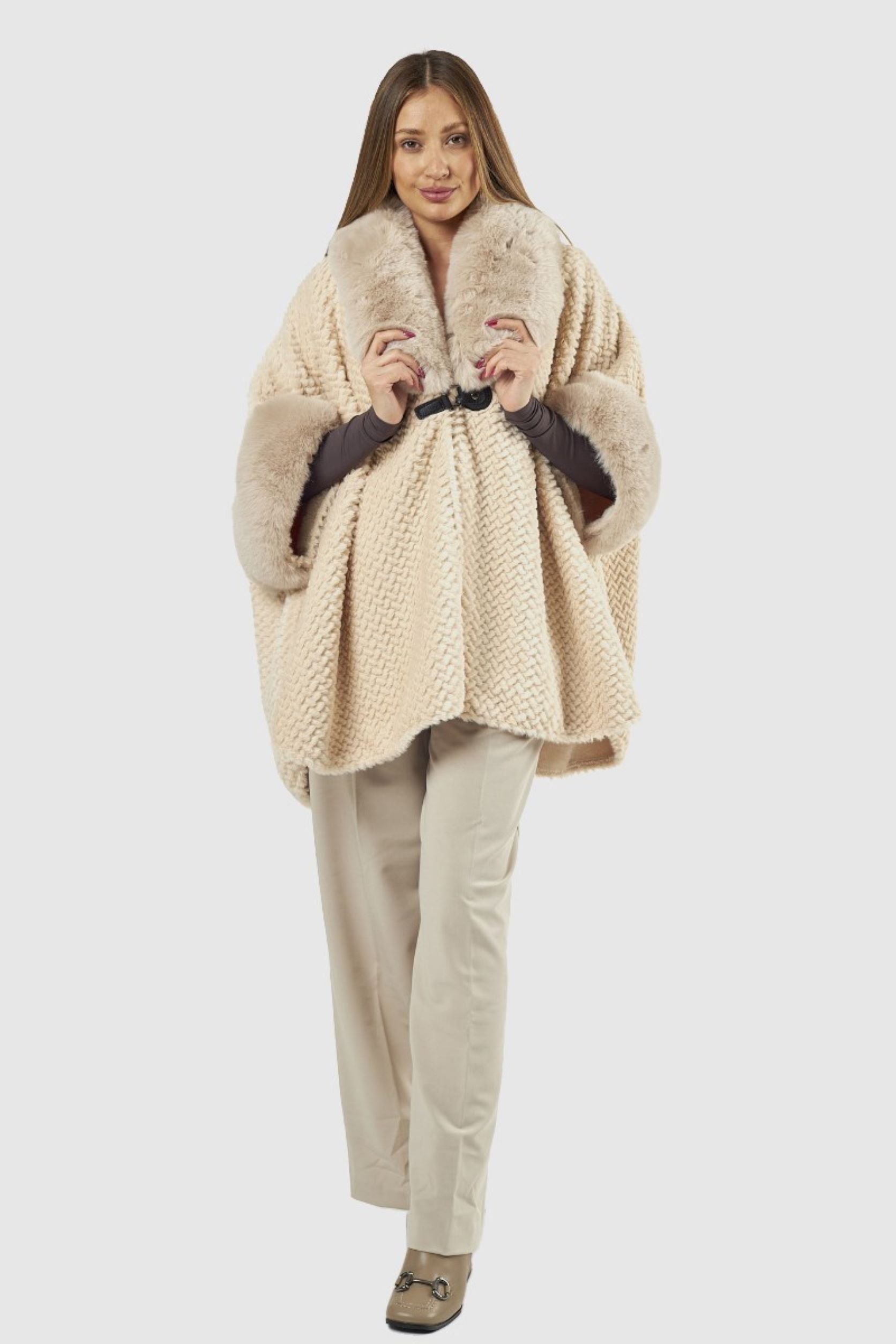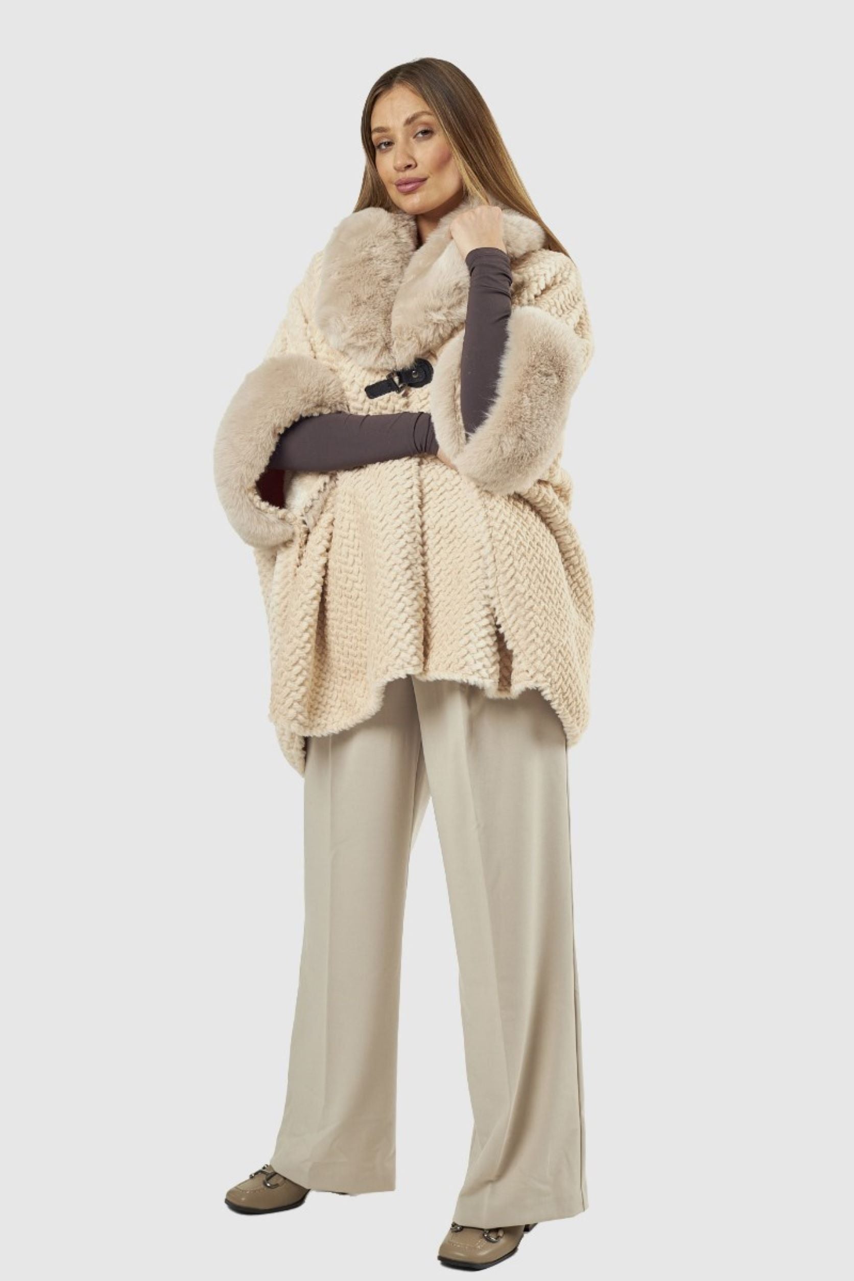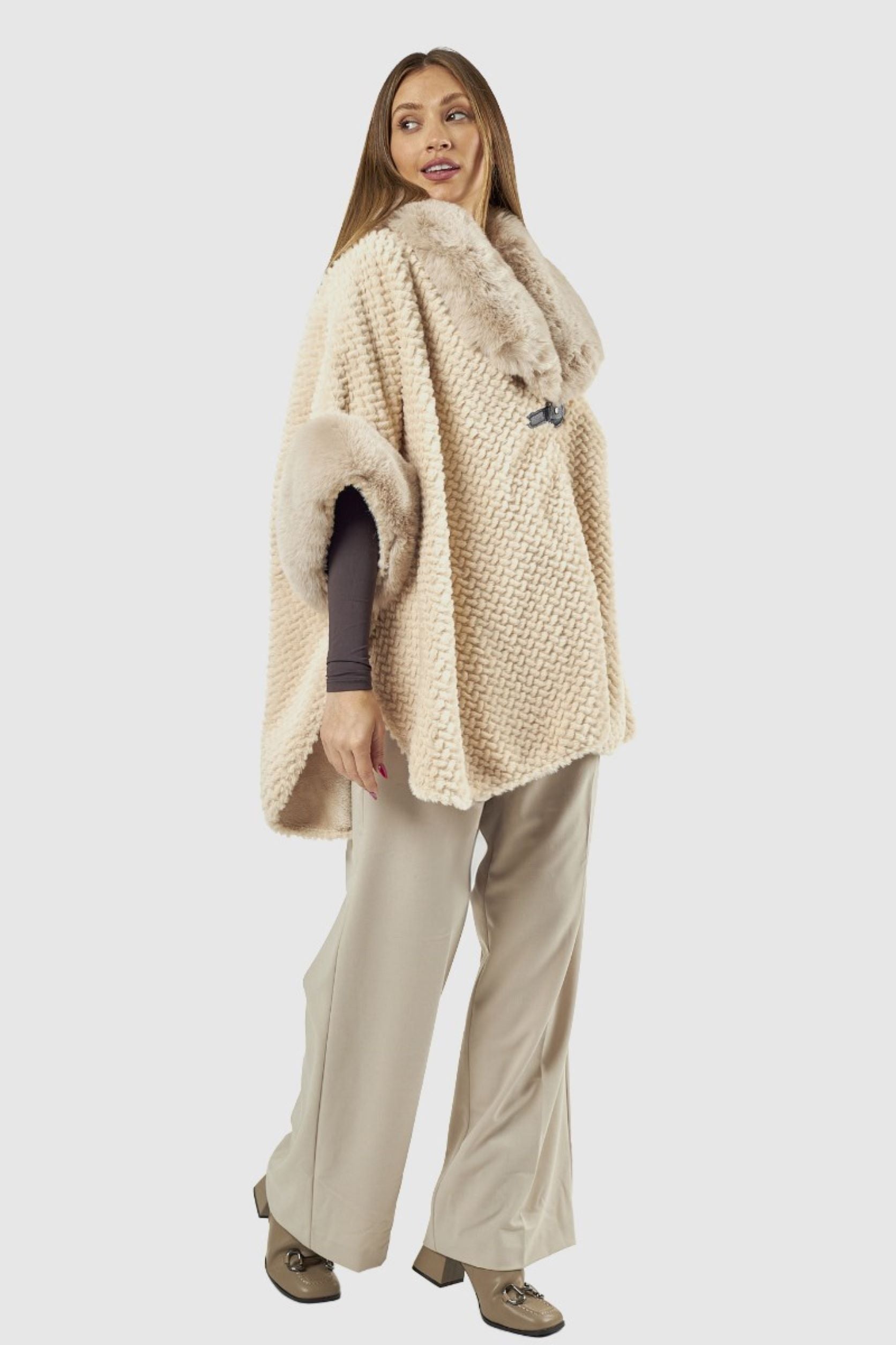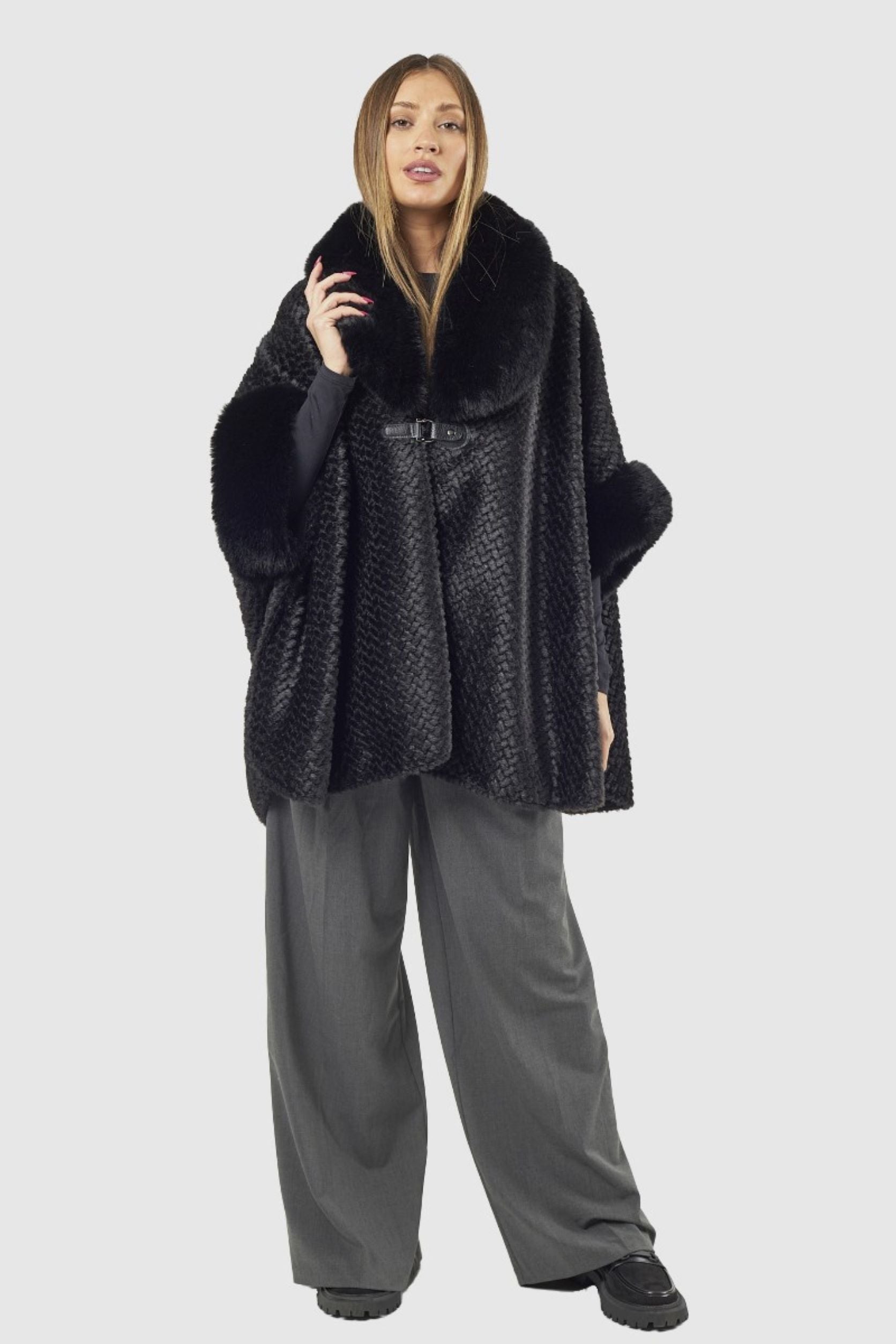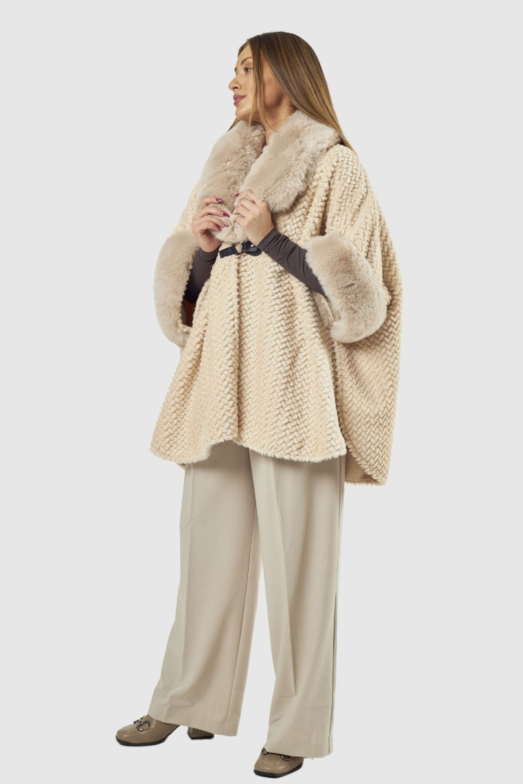 Capa com pêlo na gola e nas mangas, fecho na parte da frente.