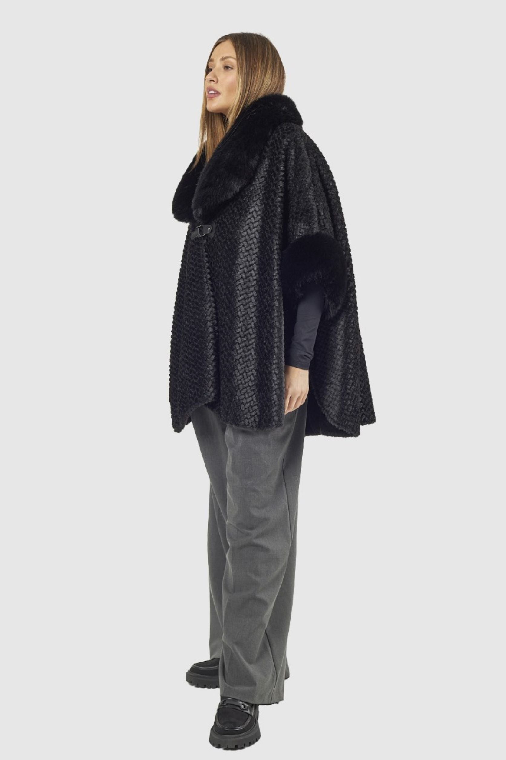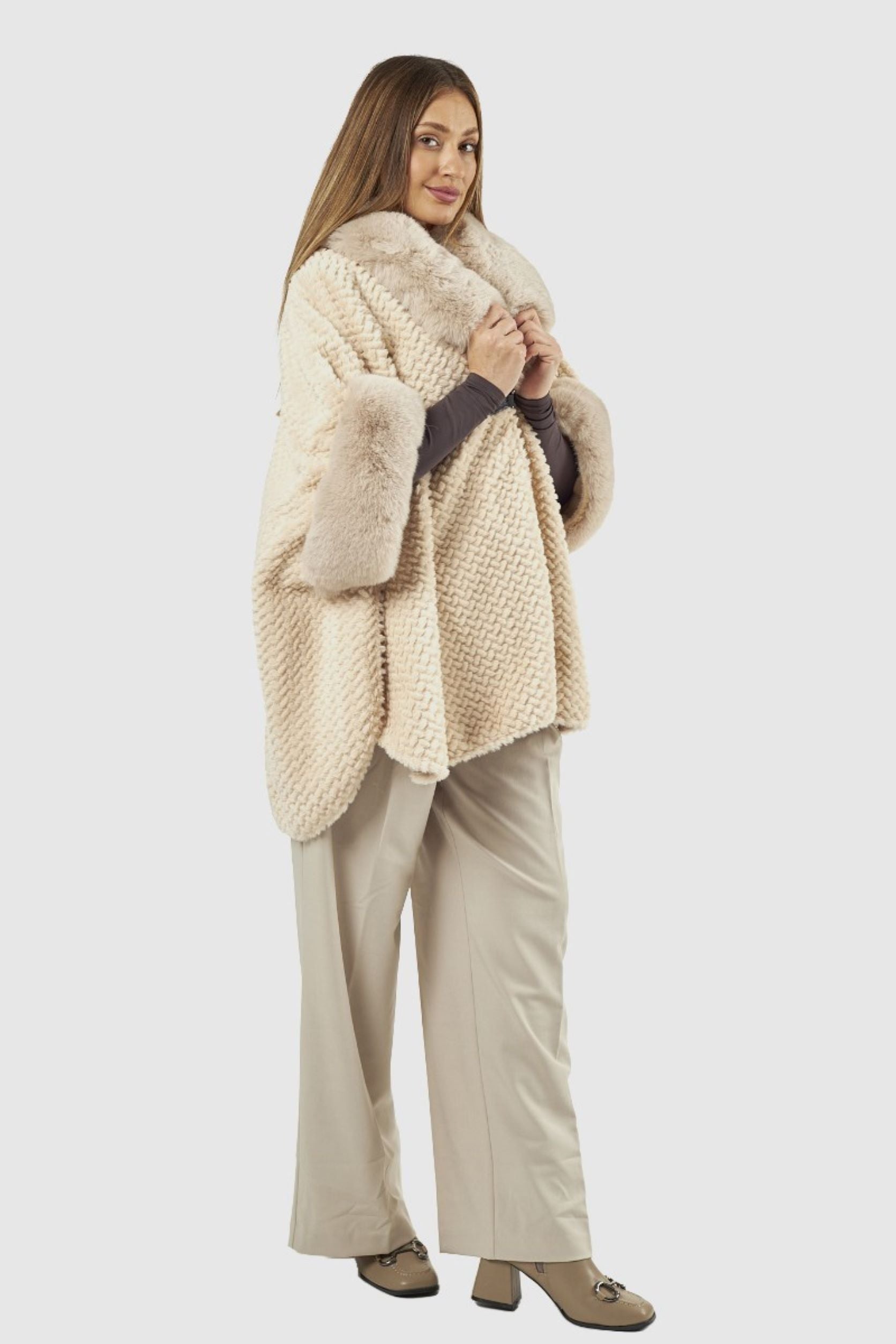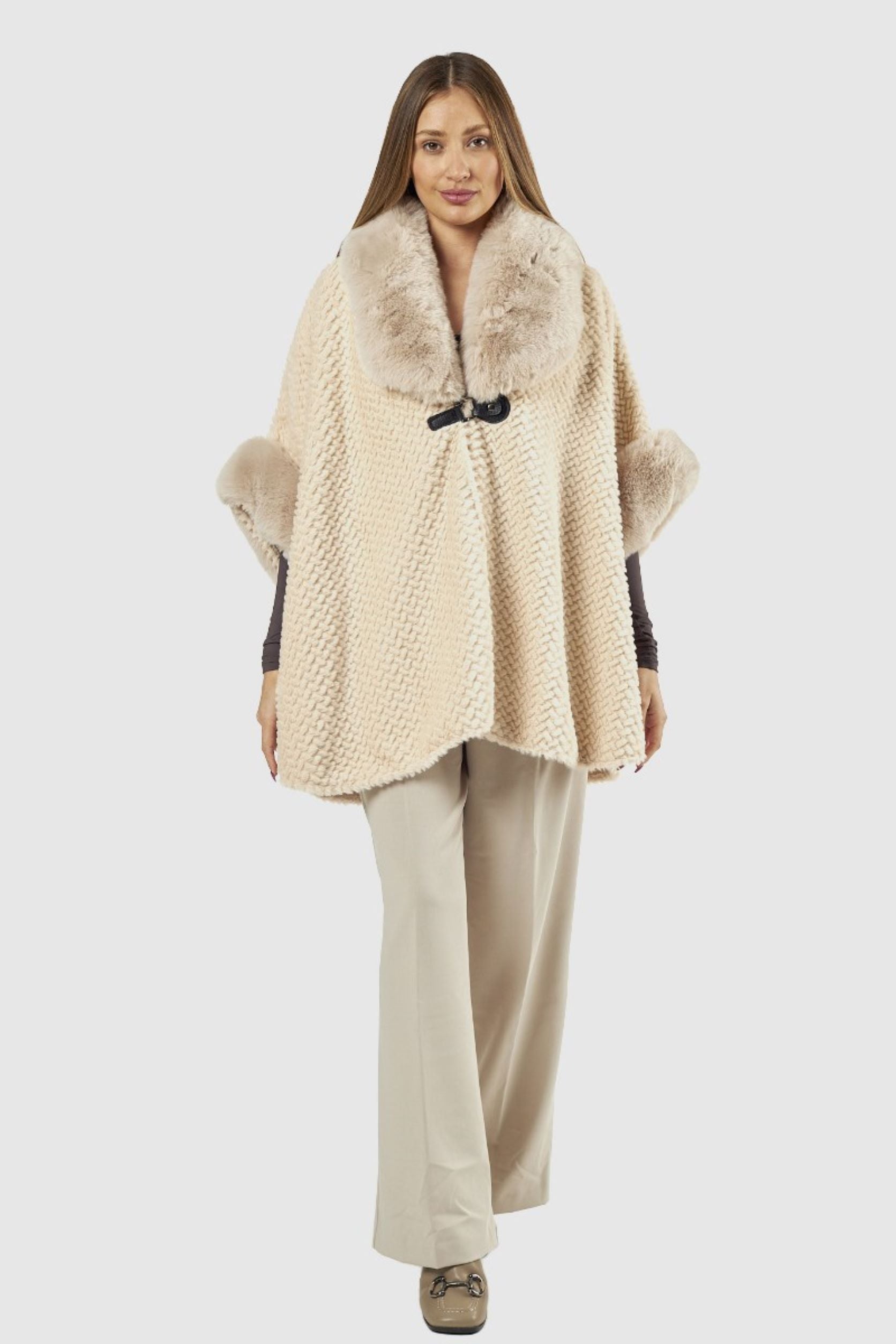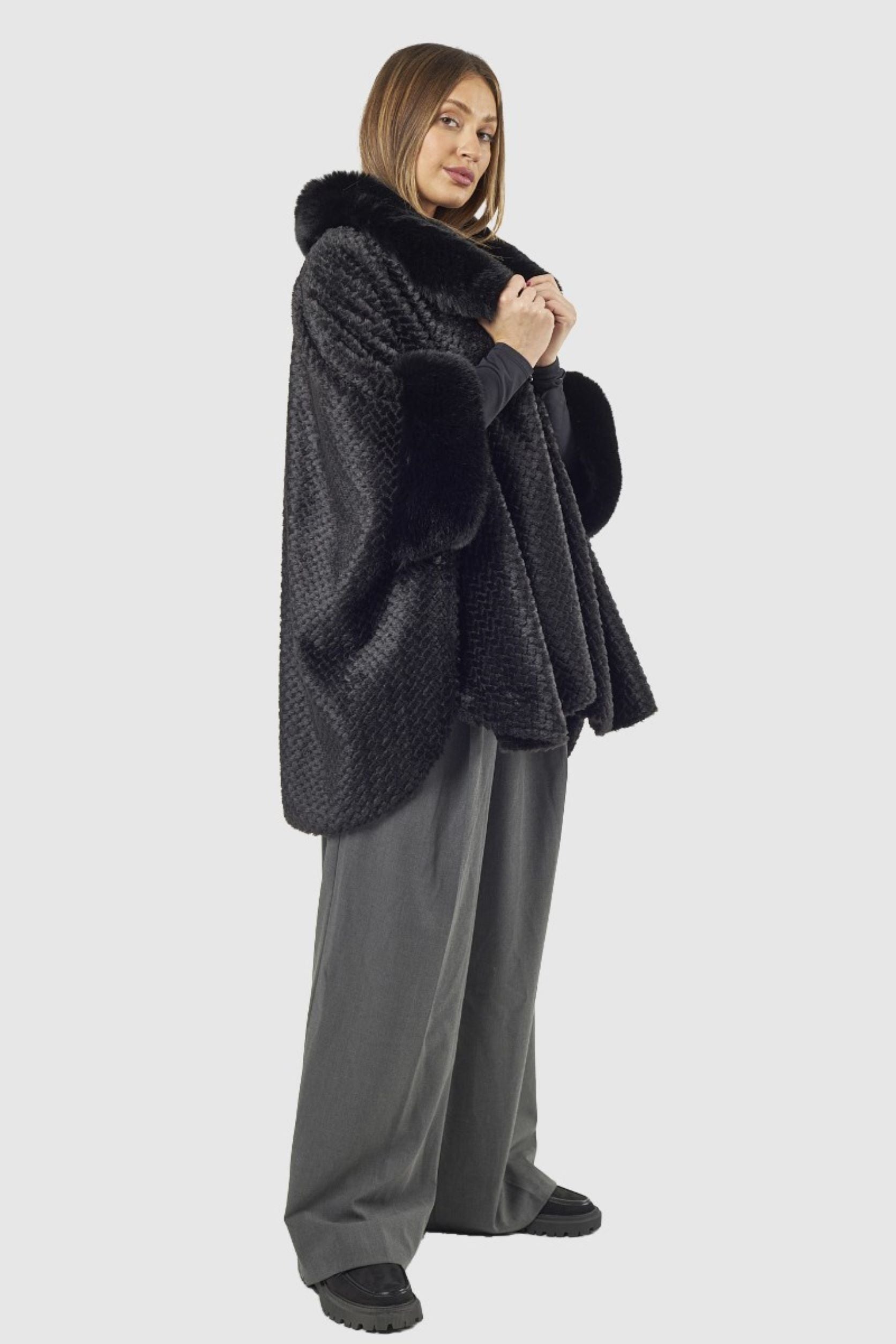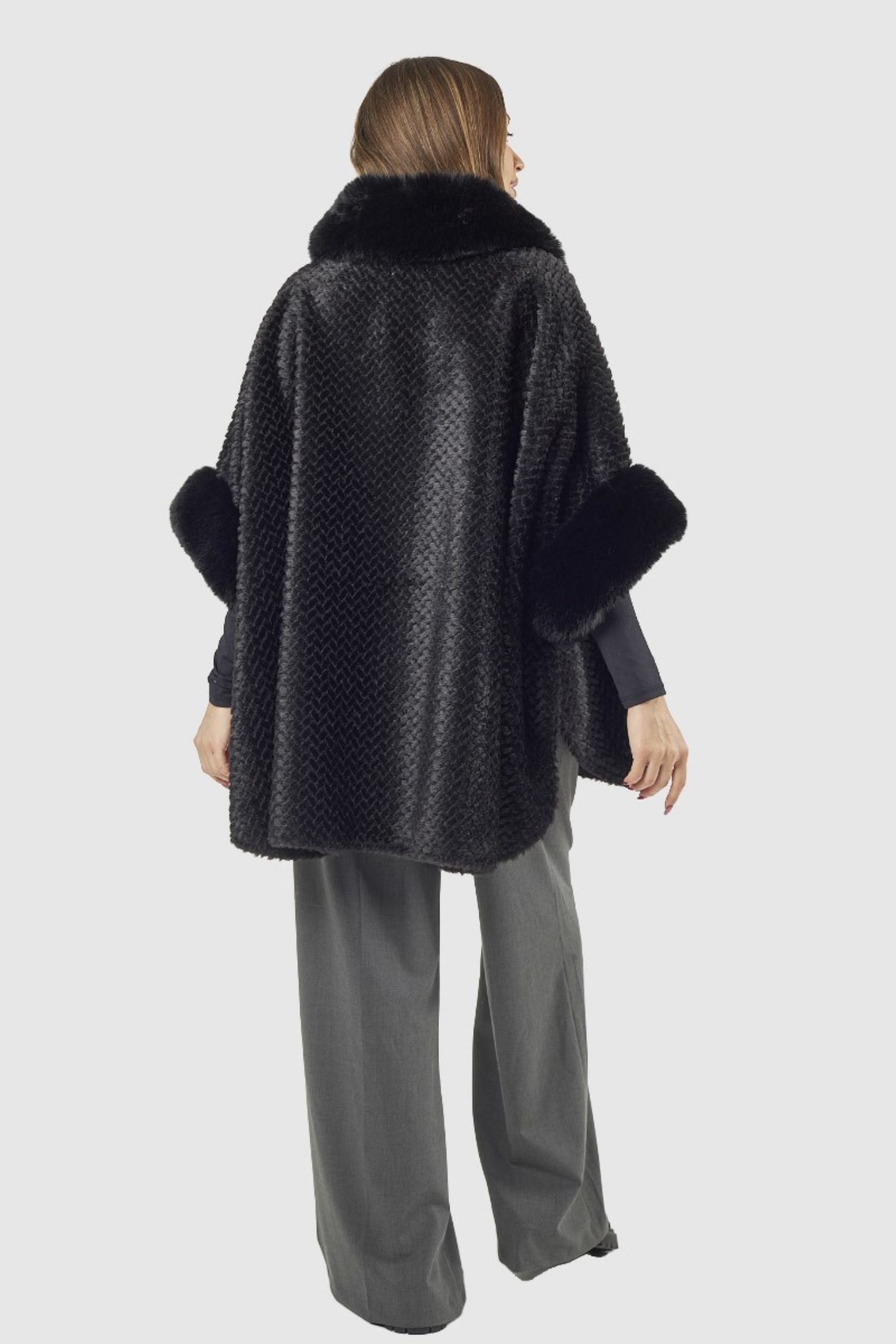 Capa com pêlo na gola e nas mangas, fecho na parte da frente.