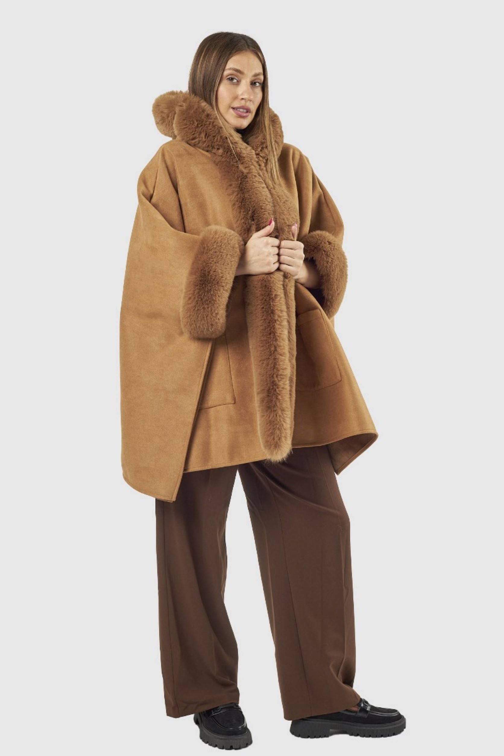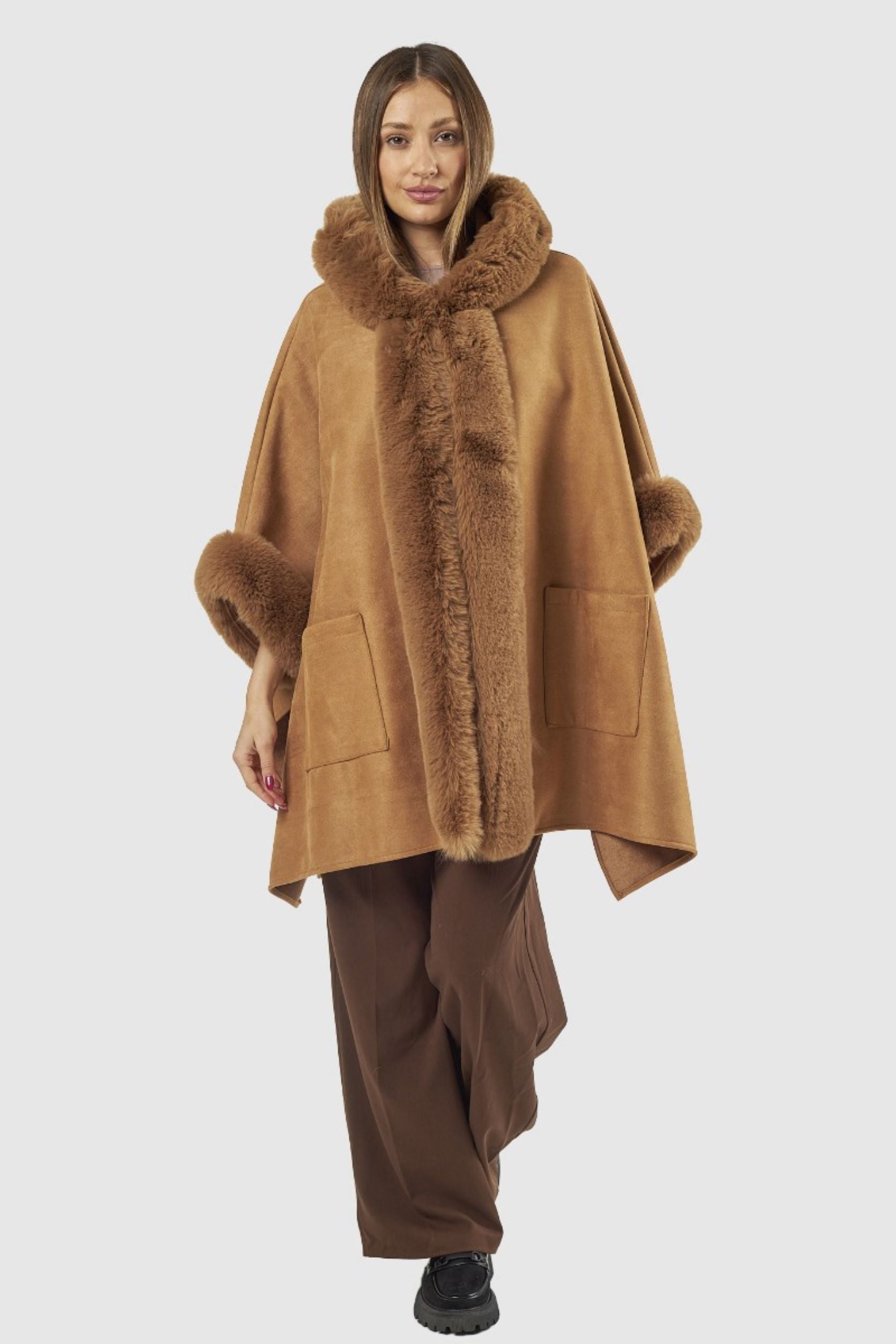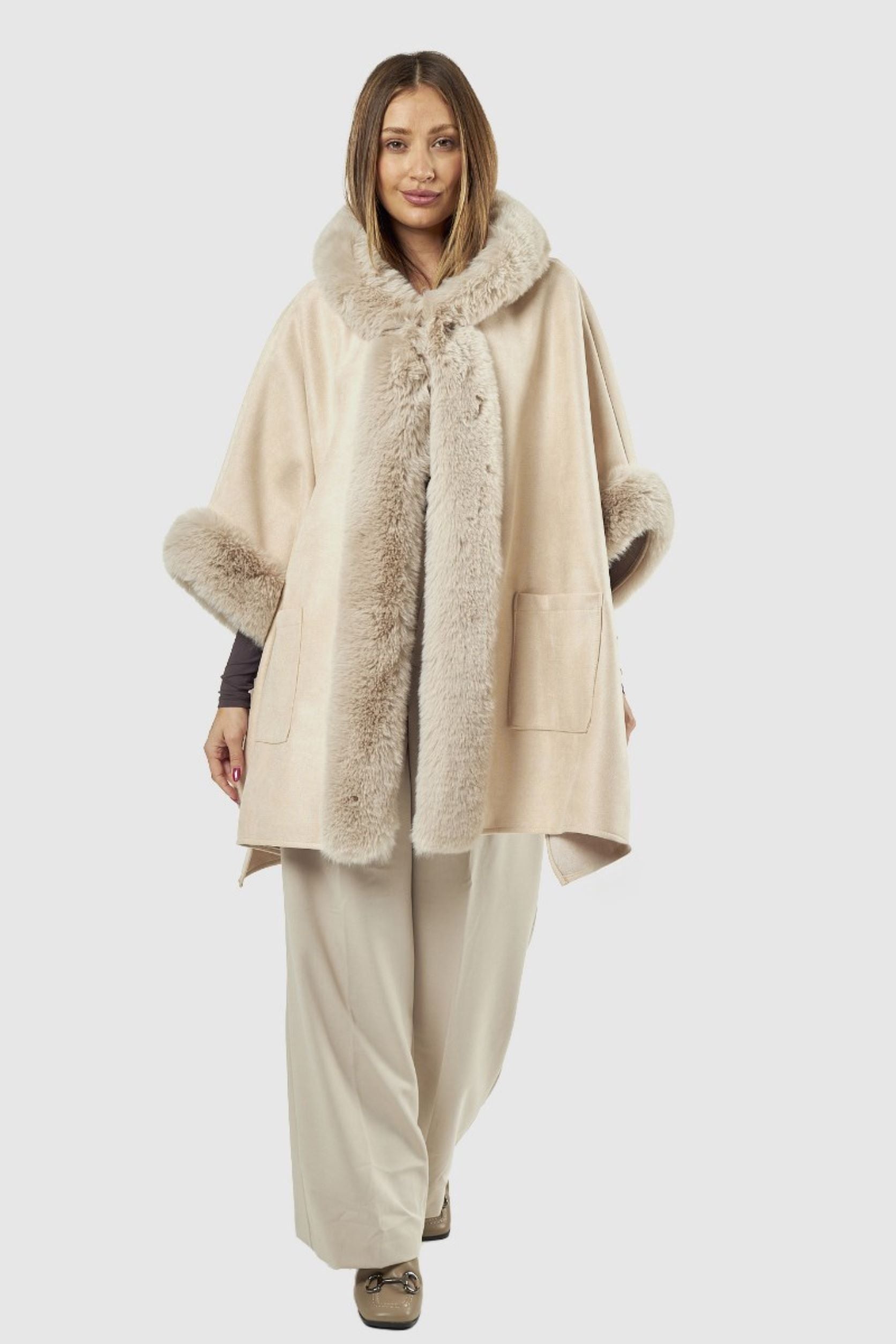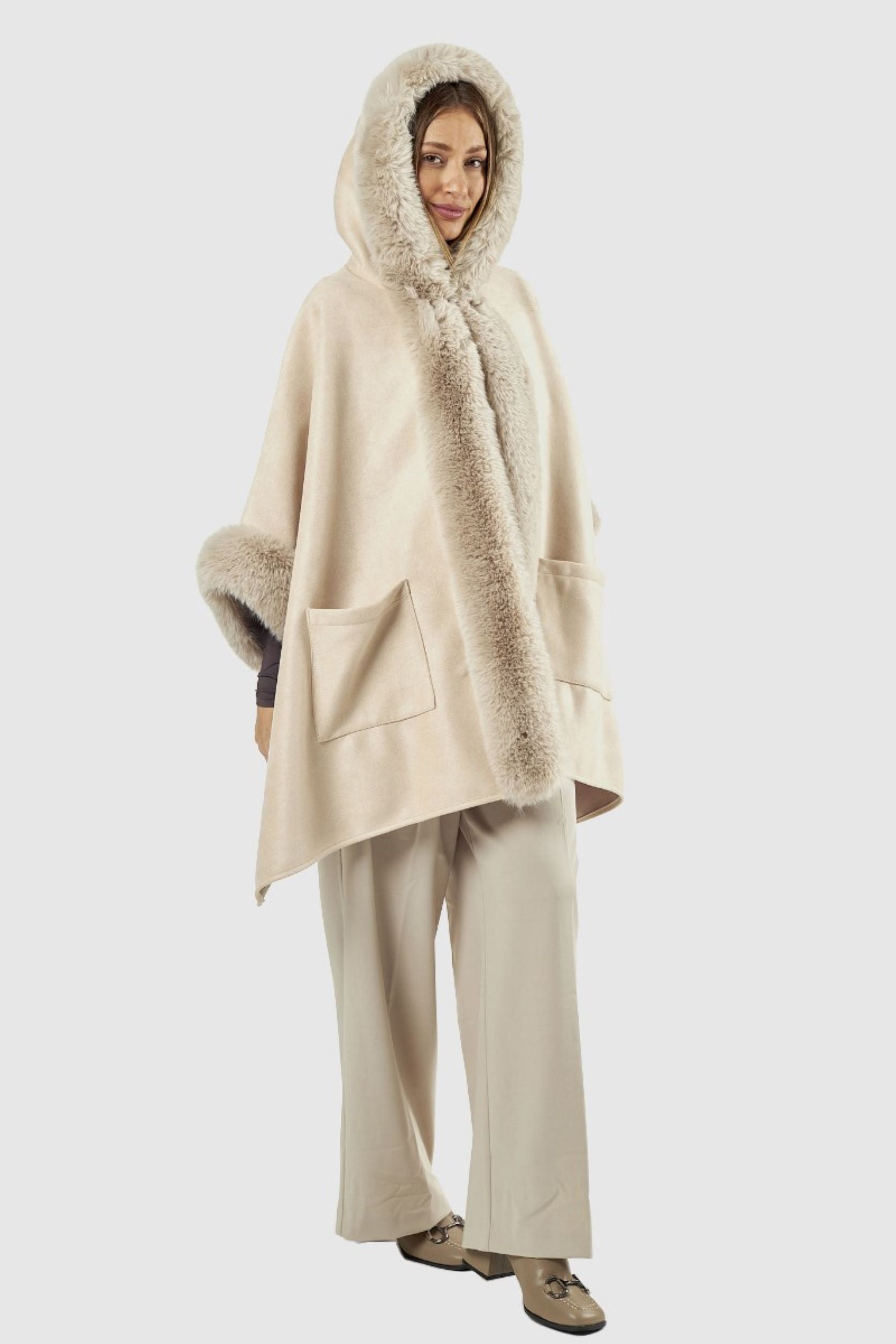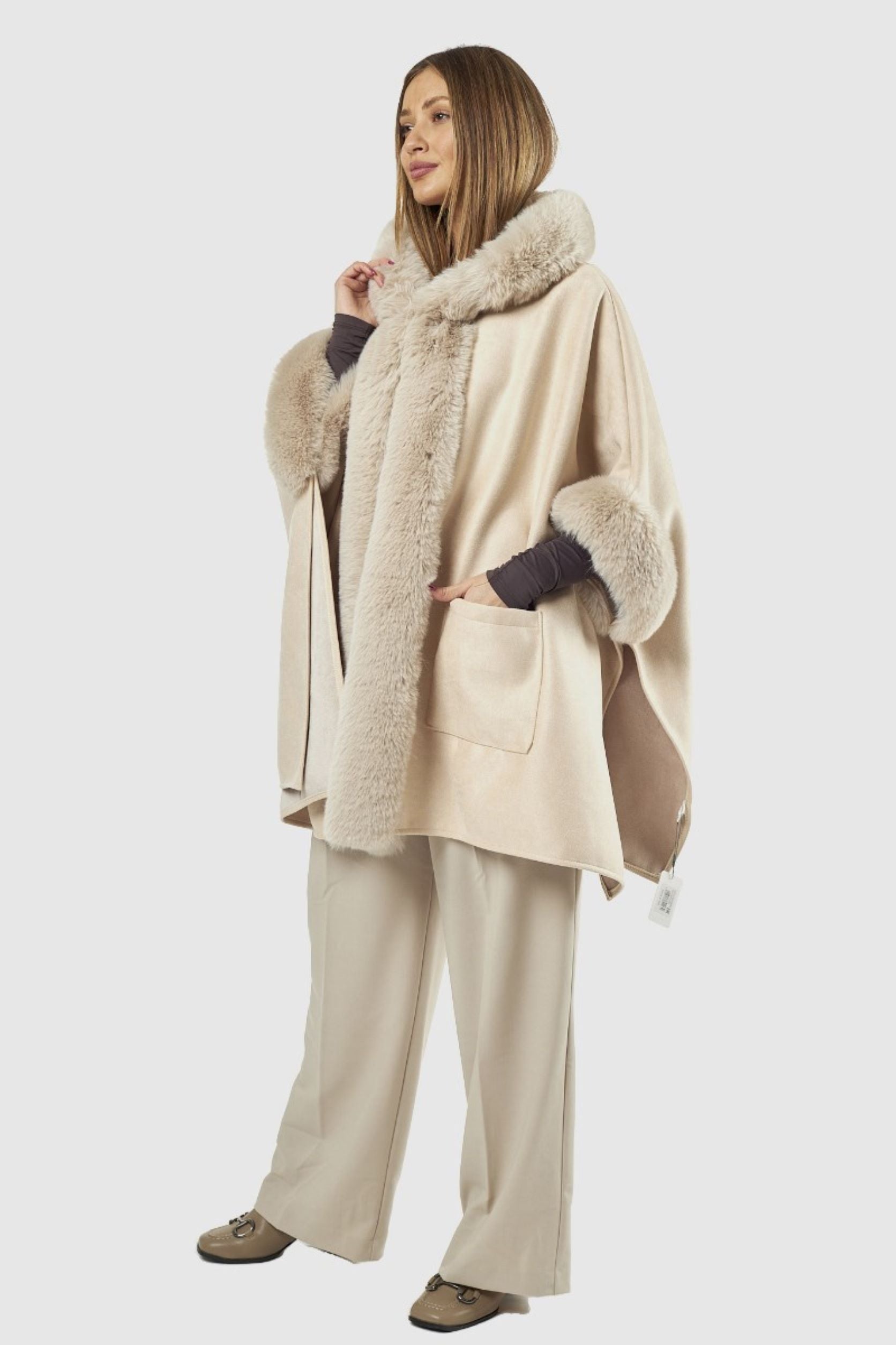 Capa com pêlo na gola, nas mangas e na parte da frente. Dois bolsos na parte da frente.