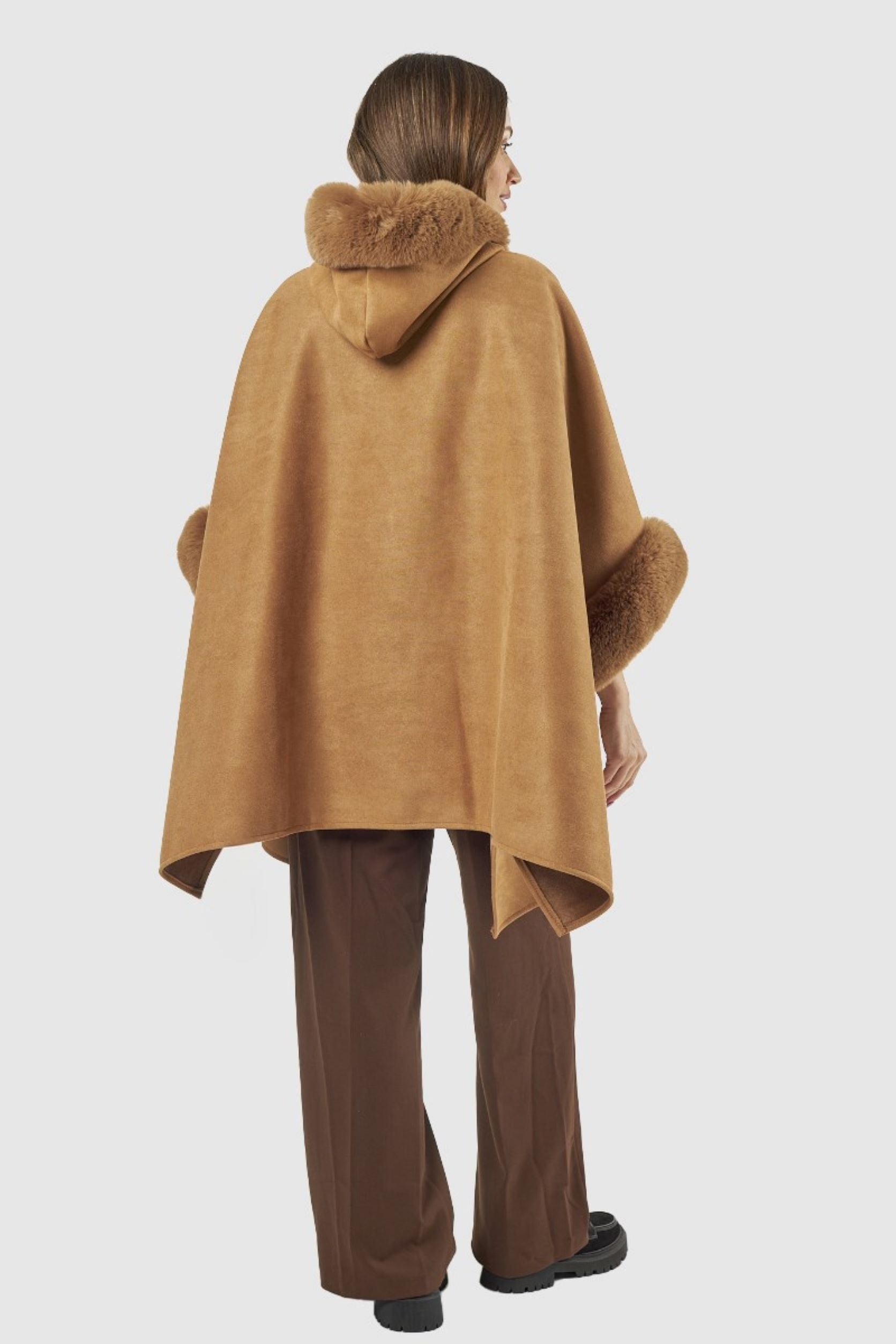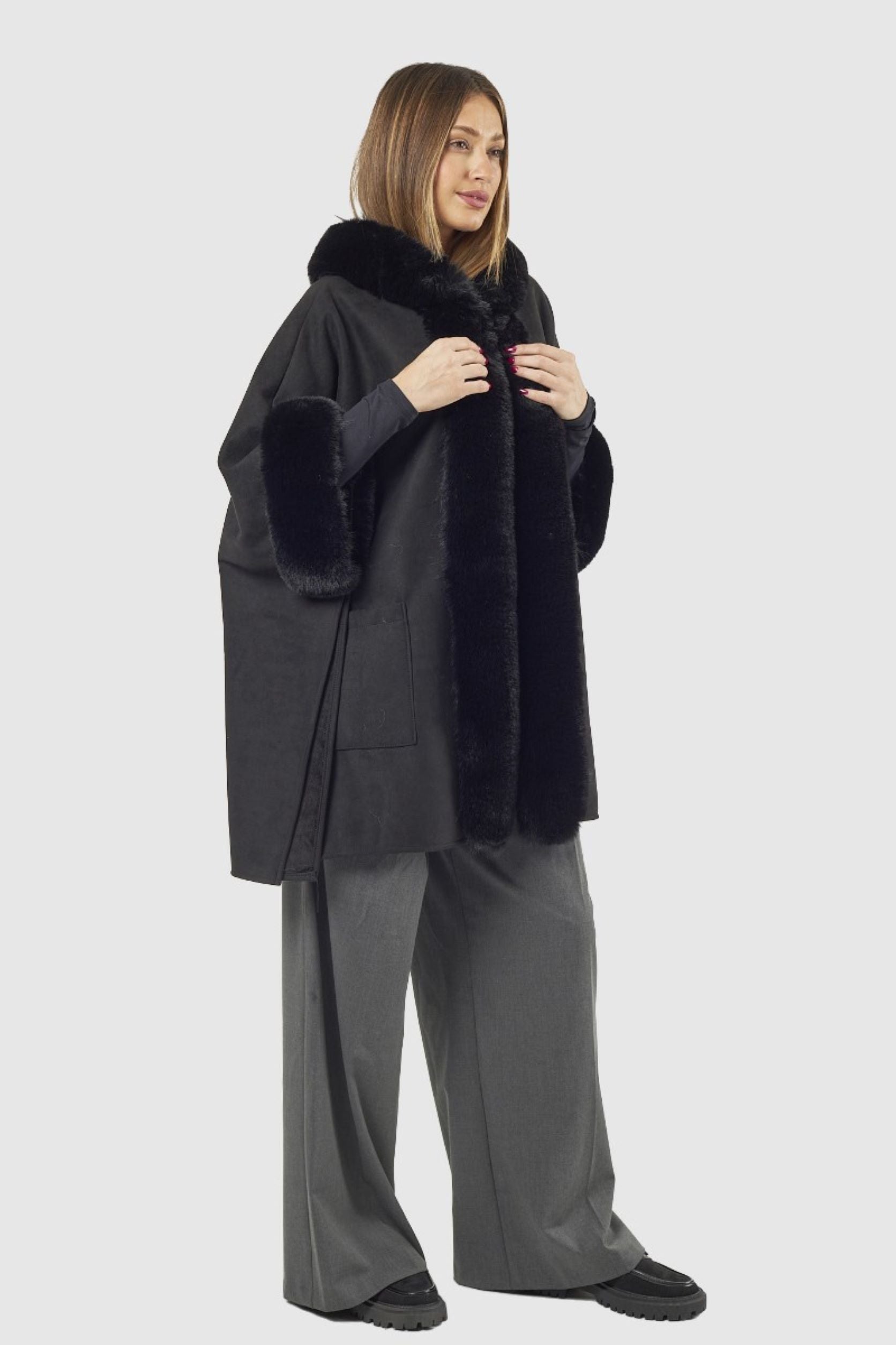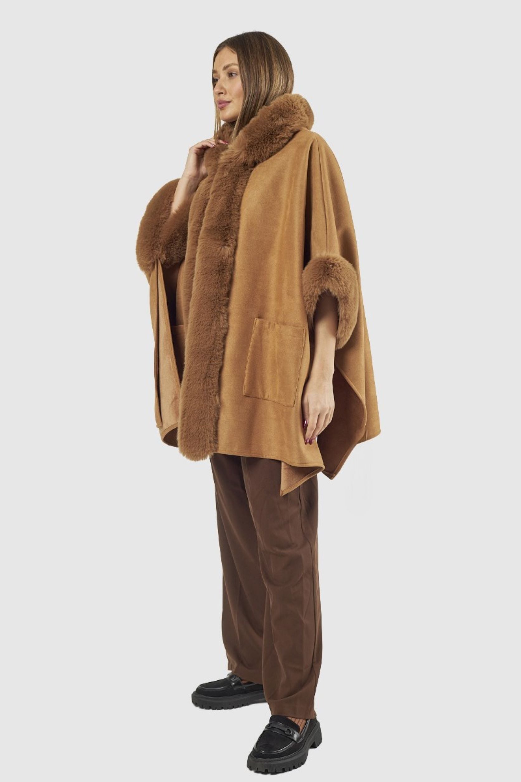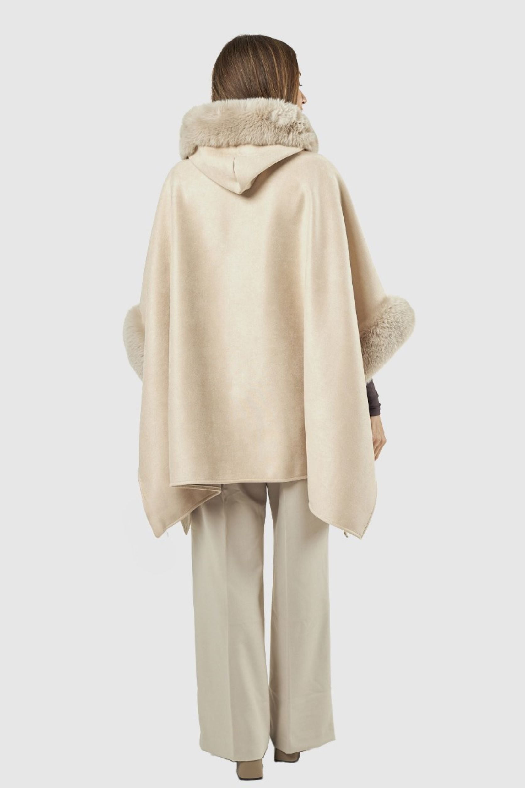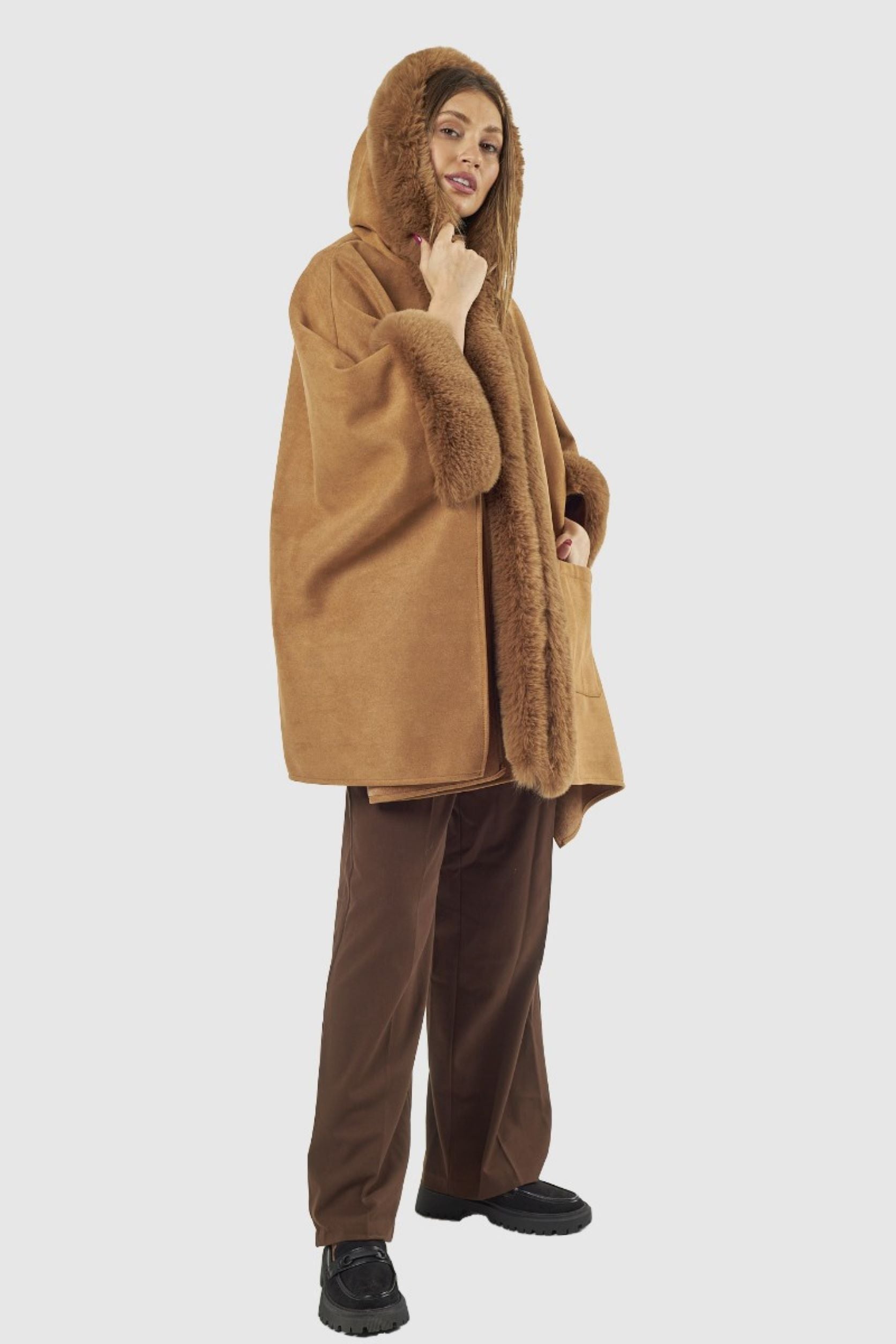 Capa com pêlo na gola, nas mangas e na parte da frente. Dois bolsos na parte da frente.