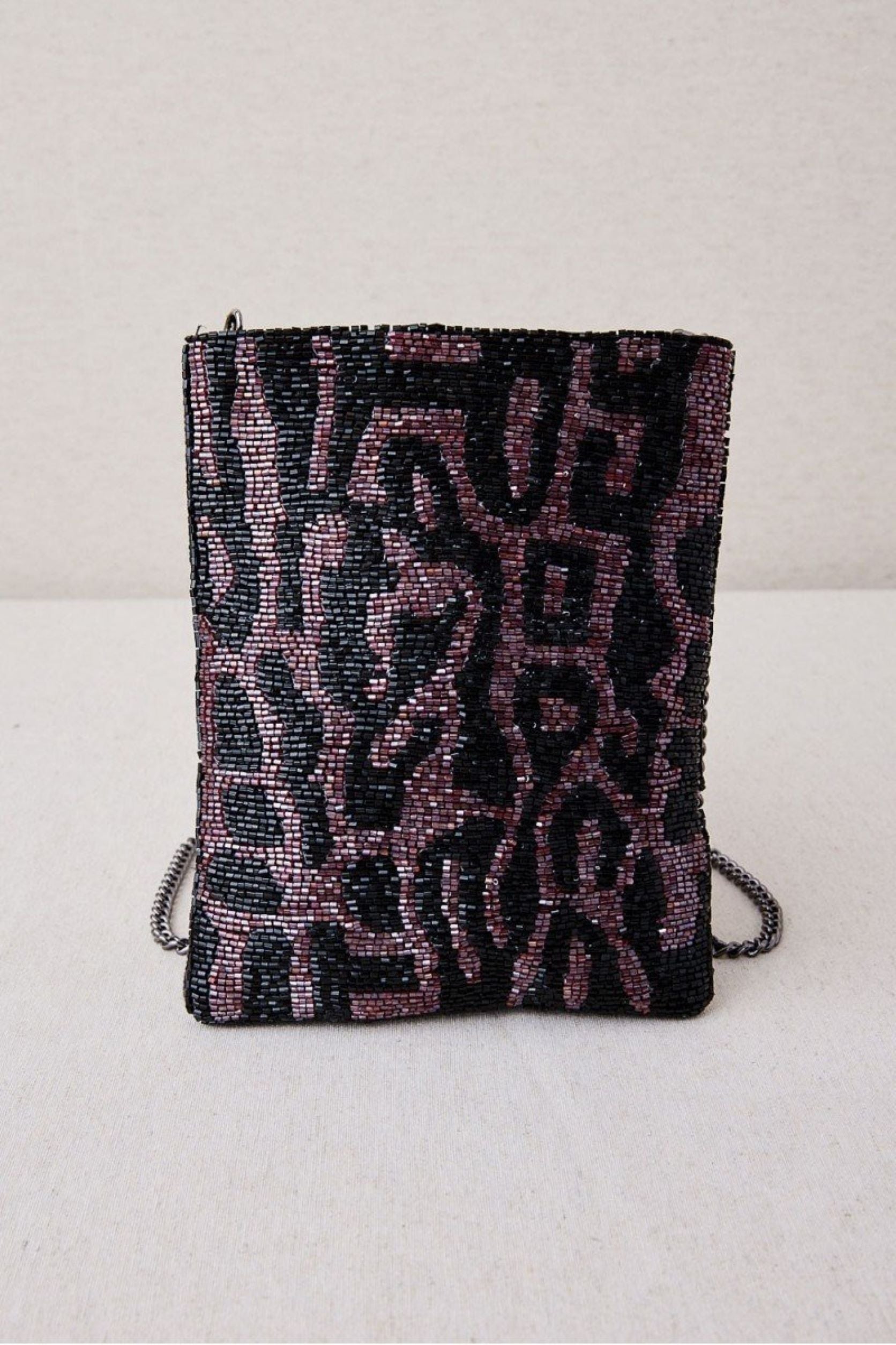 Bolsa de festa com estampado animal elaborada com contas bordadas sobre tecido de algodão. Um design chamativo e versátil que adiciona textura e personalidade a qualquer look noturno.