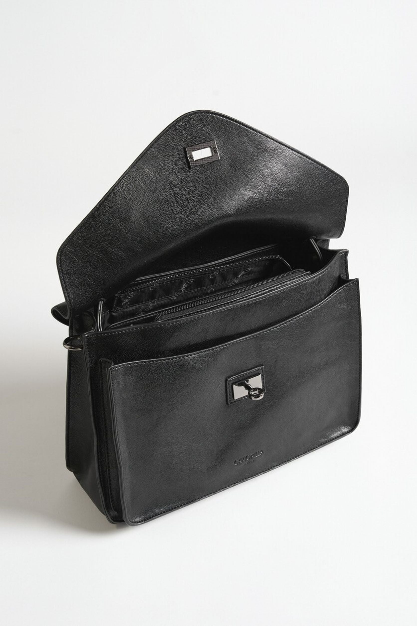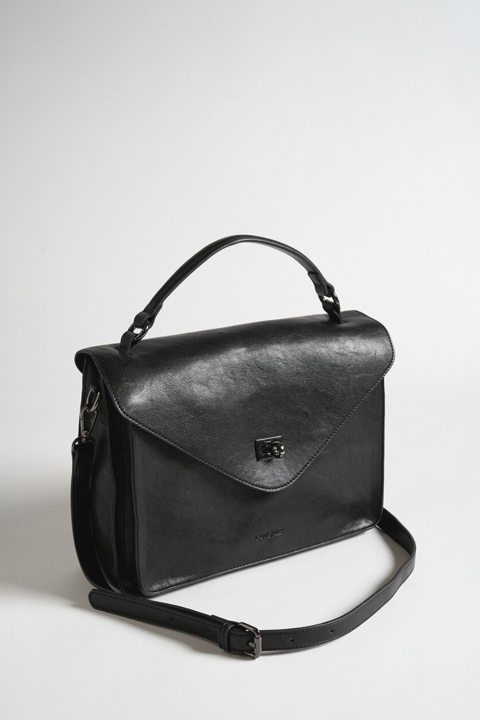 Com a sua forma estruturada e estilo retro, a bolsa Blinny reflete o charme das bolsas clássicas. Feita em couro sintético macio, possui uma aba com fecho giratório, zíper superior e detalhes em latão. A alça ajustável e removível permite usá-la no ombro.