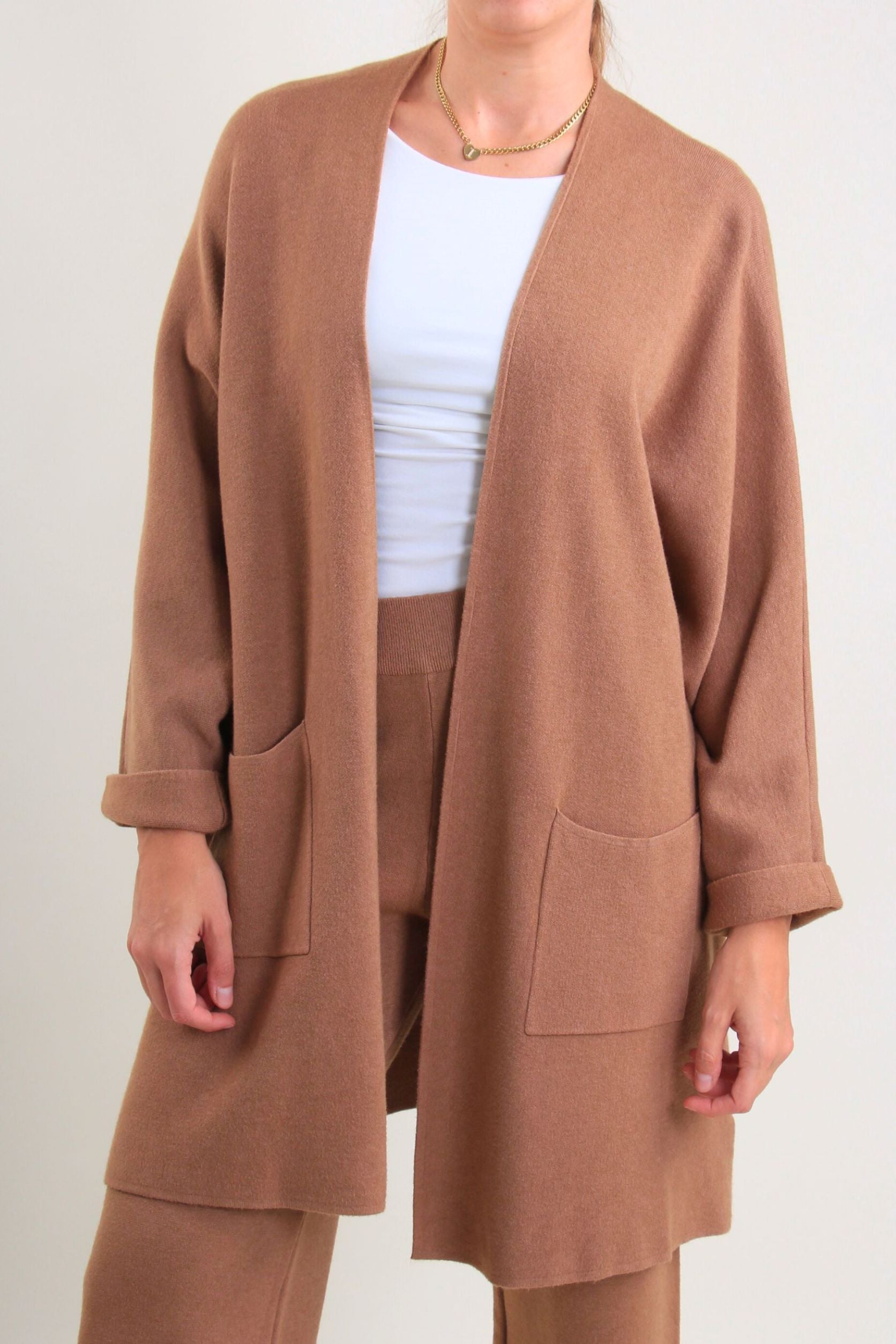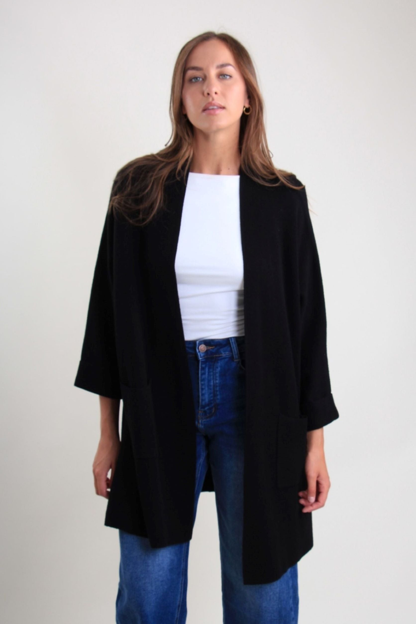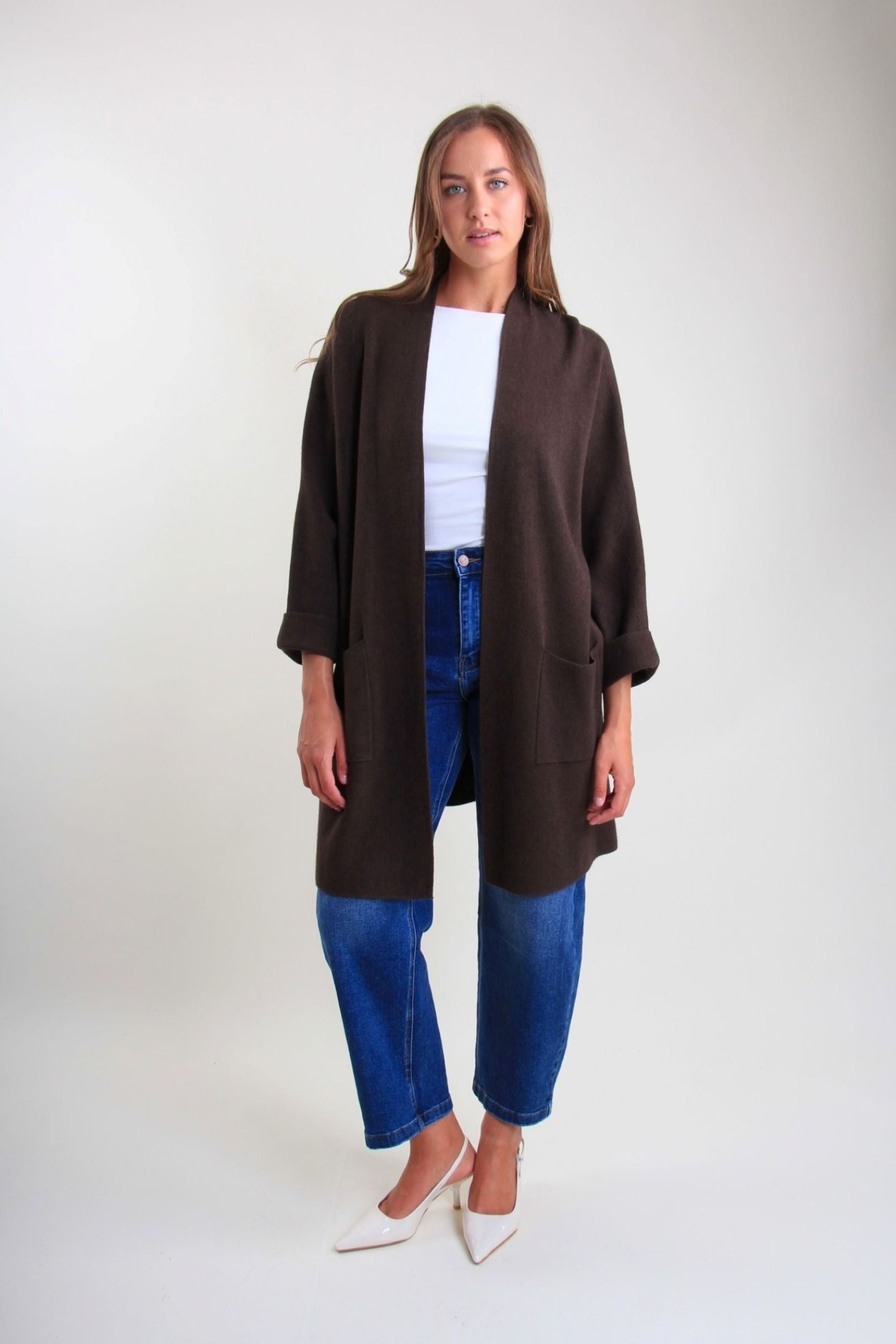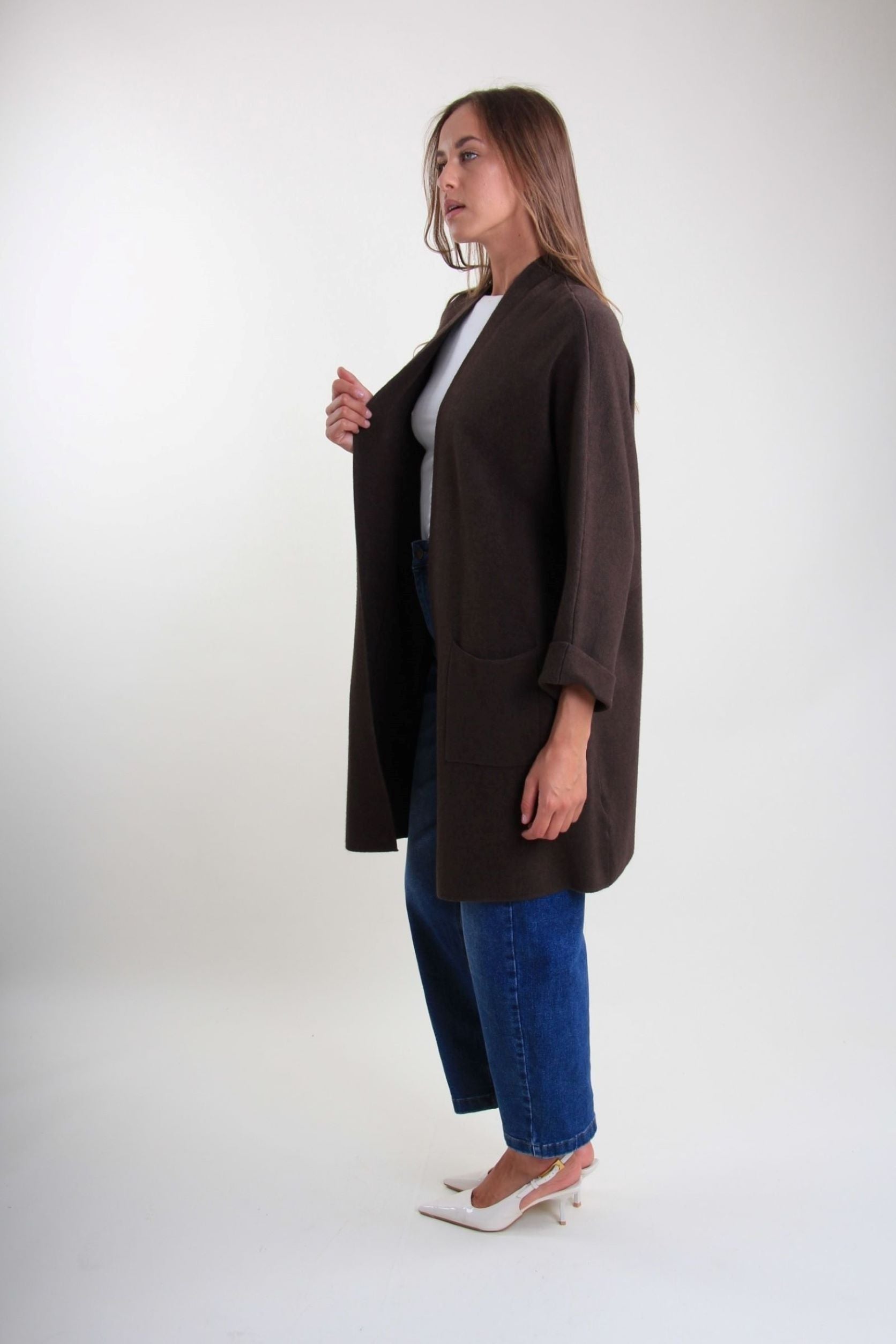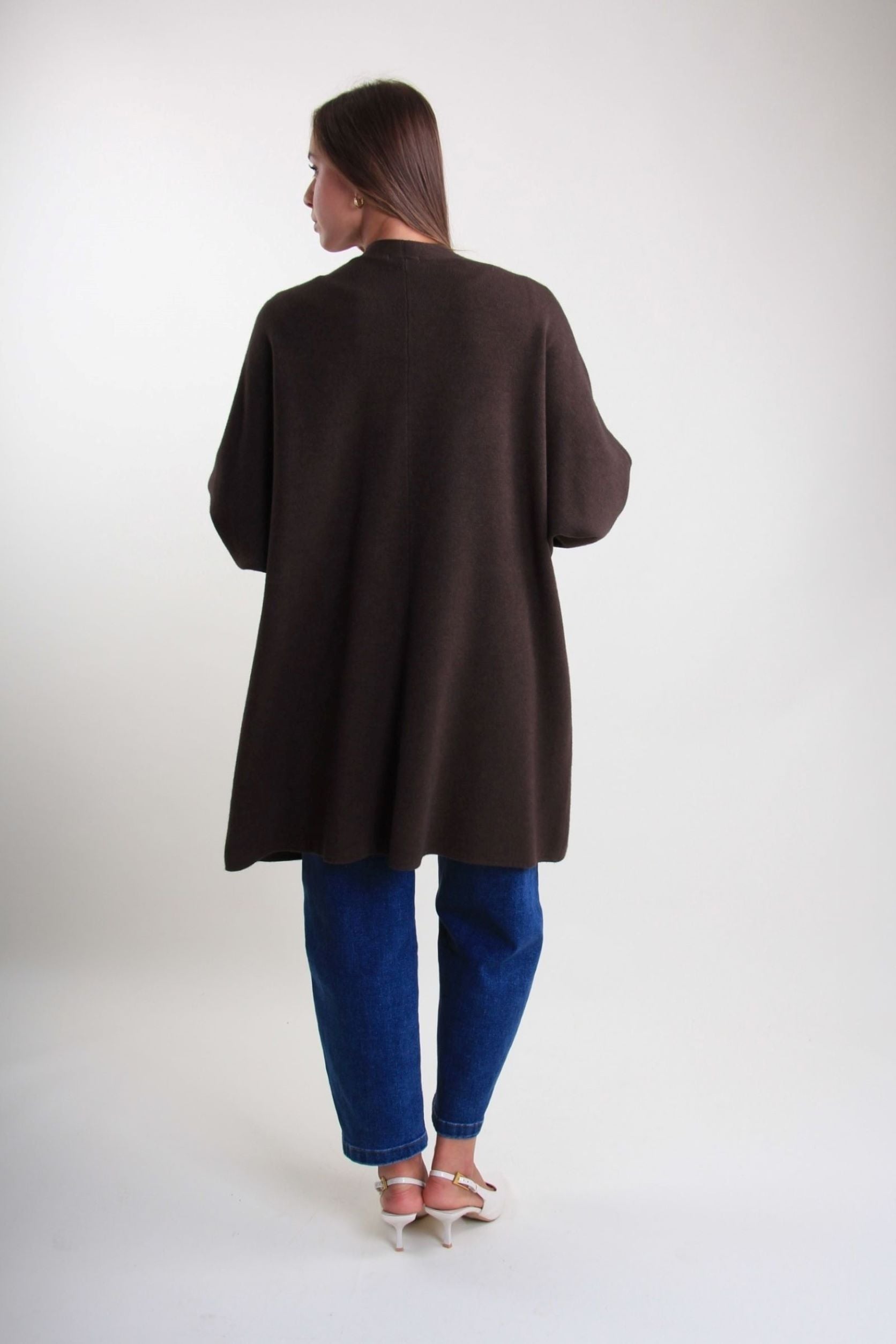 O casaco é uma peça versátil. O design sem fechos e a linha deslizante tornam-no ideal para usar sobre camisolas, camisas ou vestidos, para criar looks em camadas com um estilo contemporâneo.