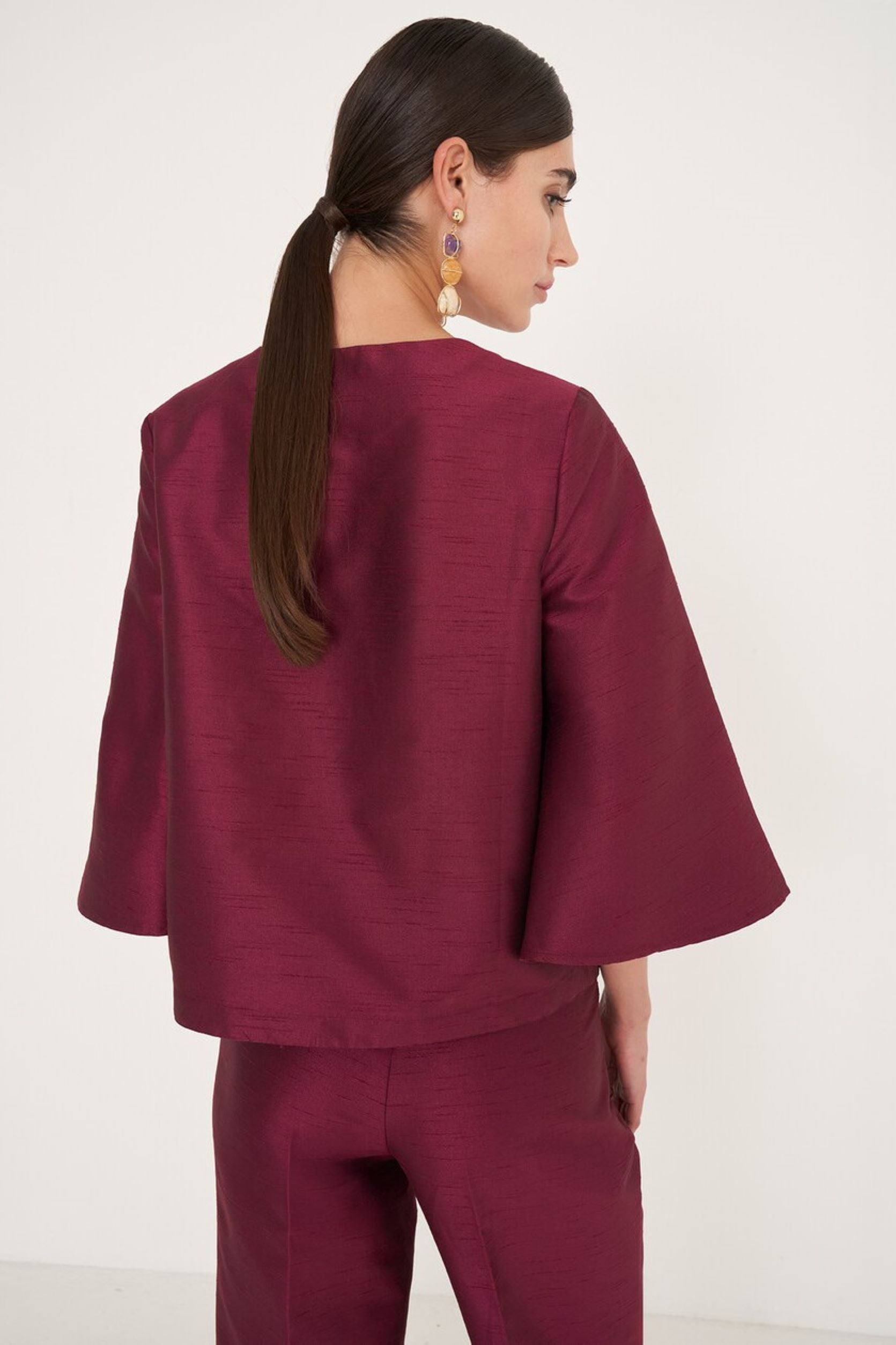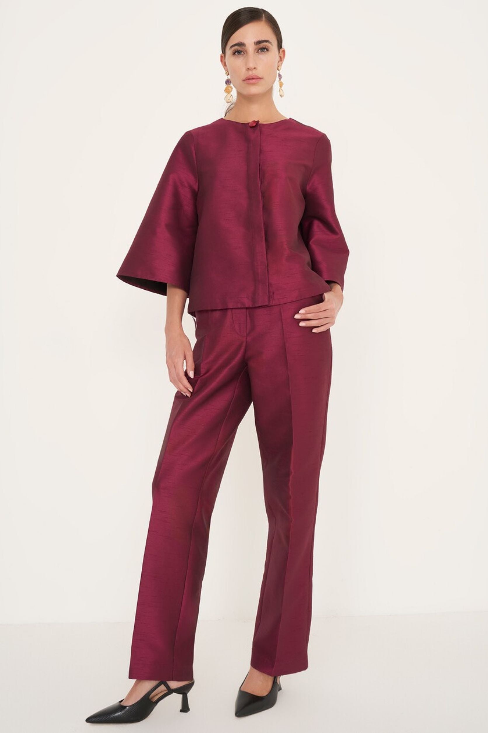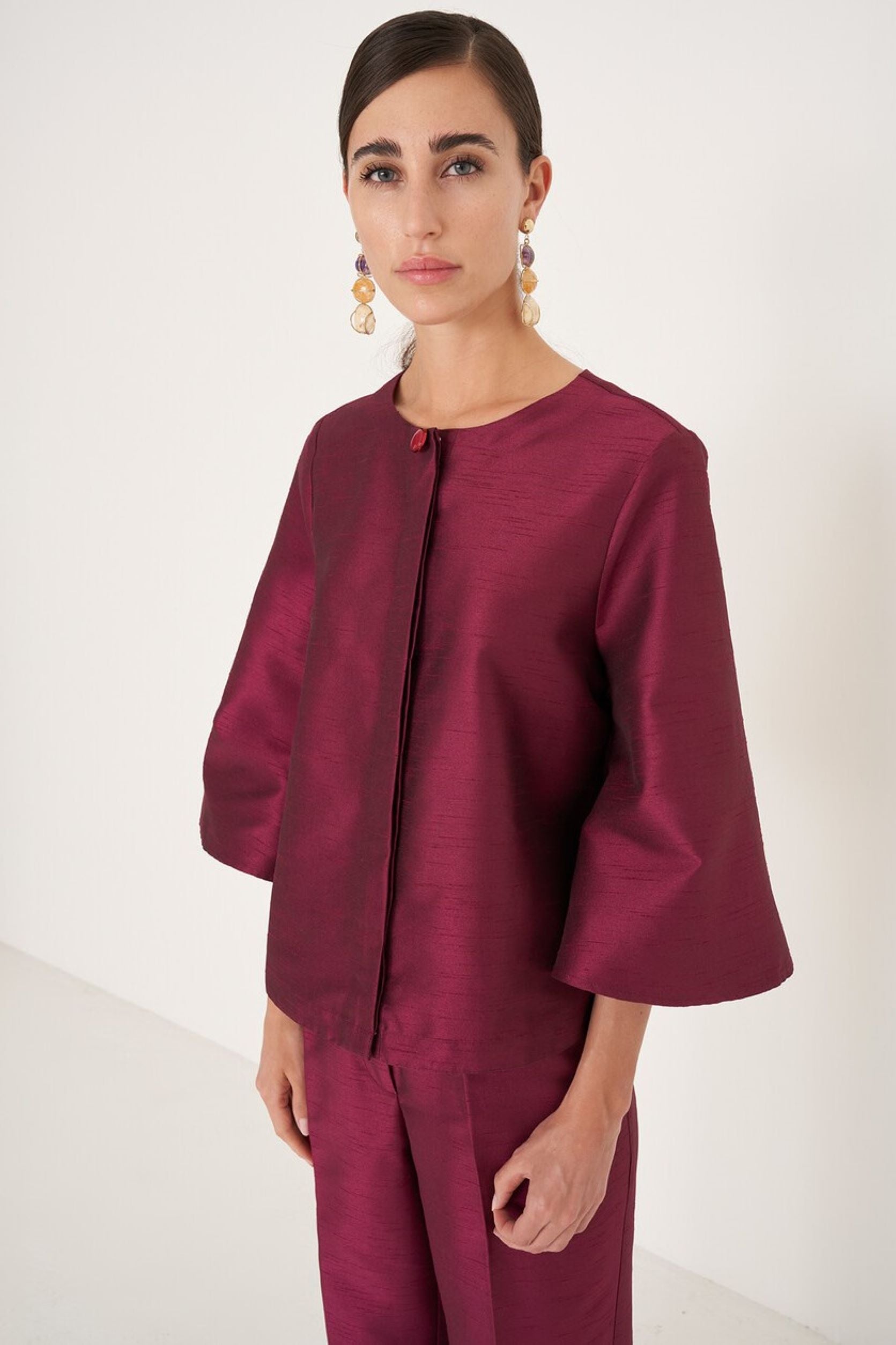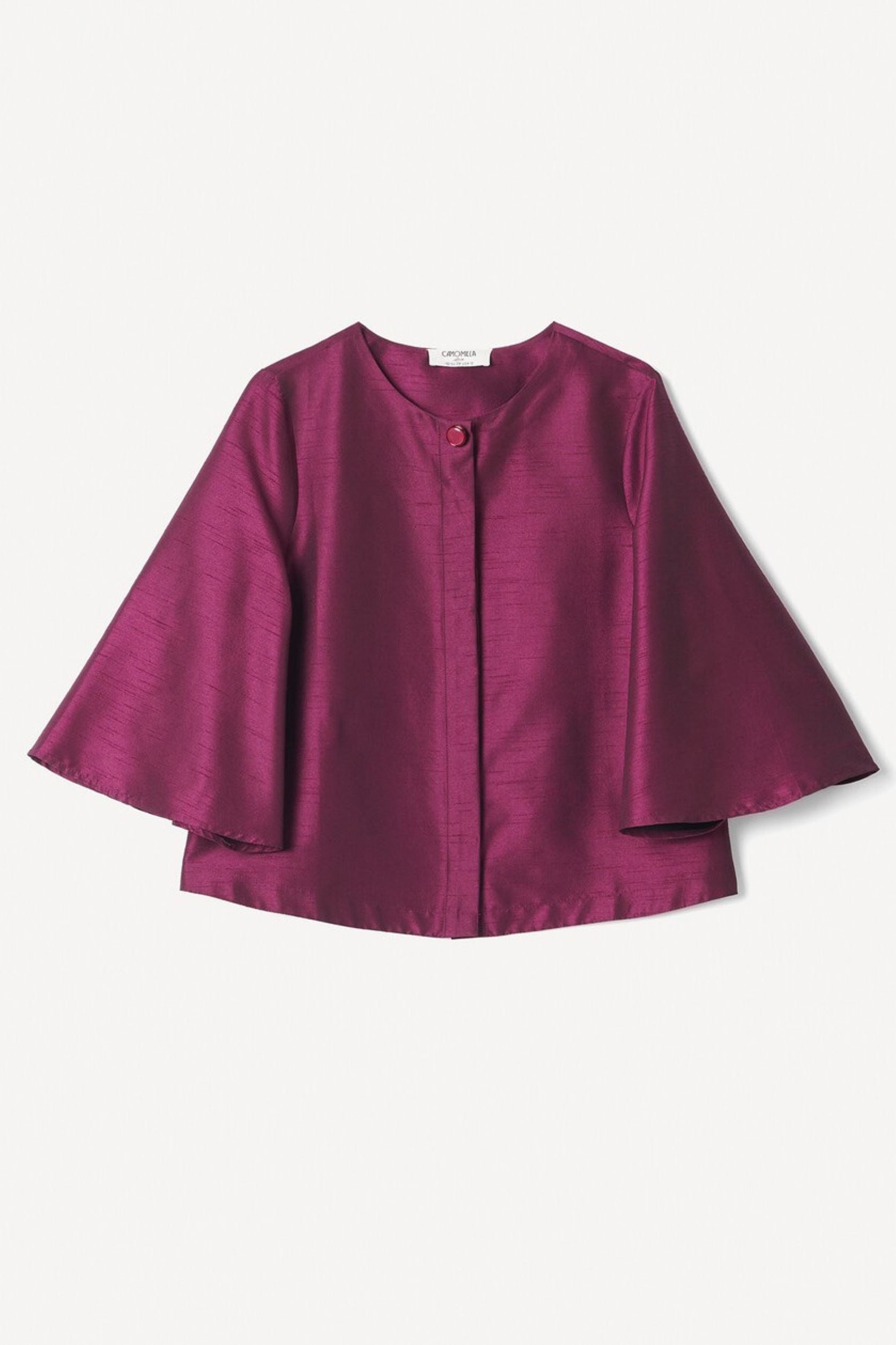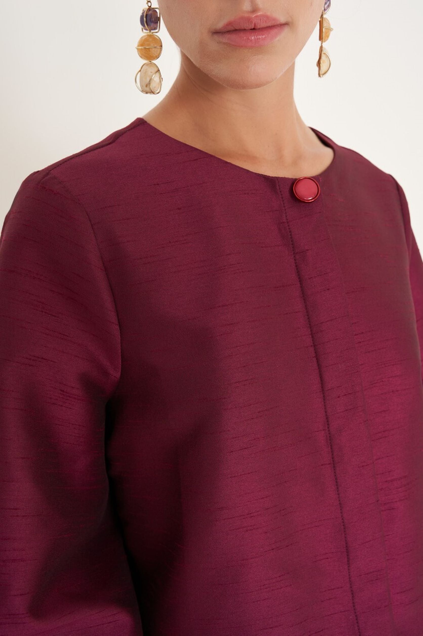Caryl é um casaco estilo camisa feito em tecido shantung, com fecho oculto com molas na frente e um botão de pedra tom sobre tom visível na gola. As mangas largas 3/4 conferem um toque de elegância discreta. Combinado com as calças Paul a condizer e os acessórios certos, cria um fato requintado e original.
