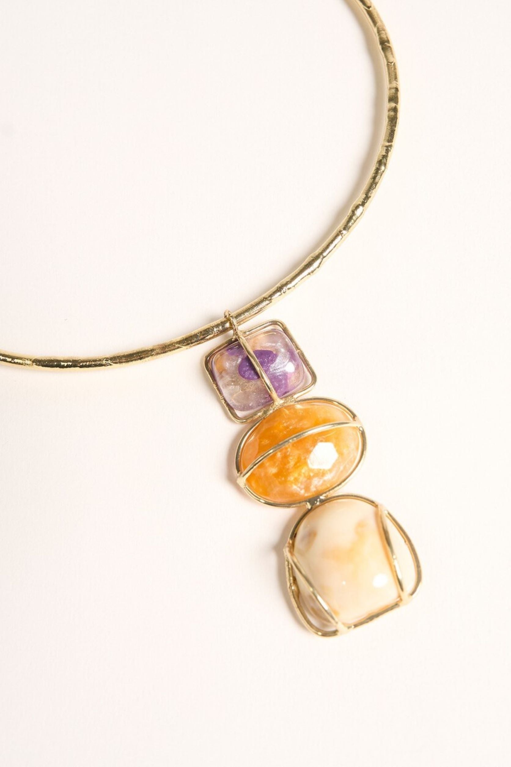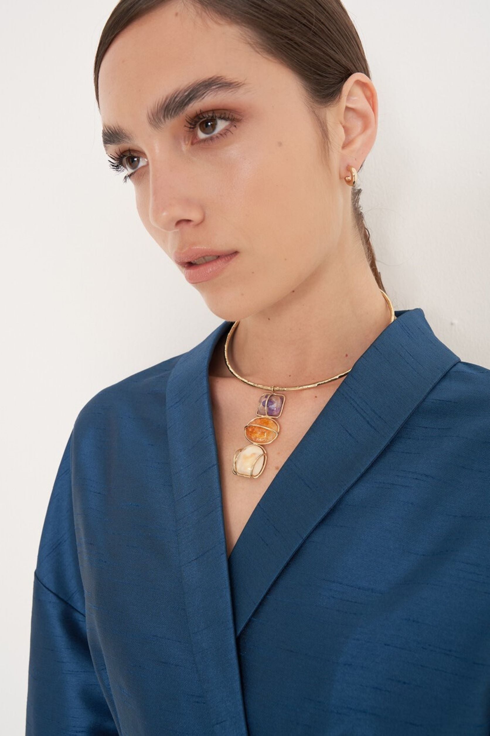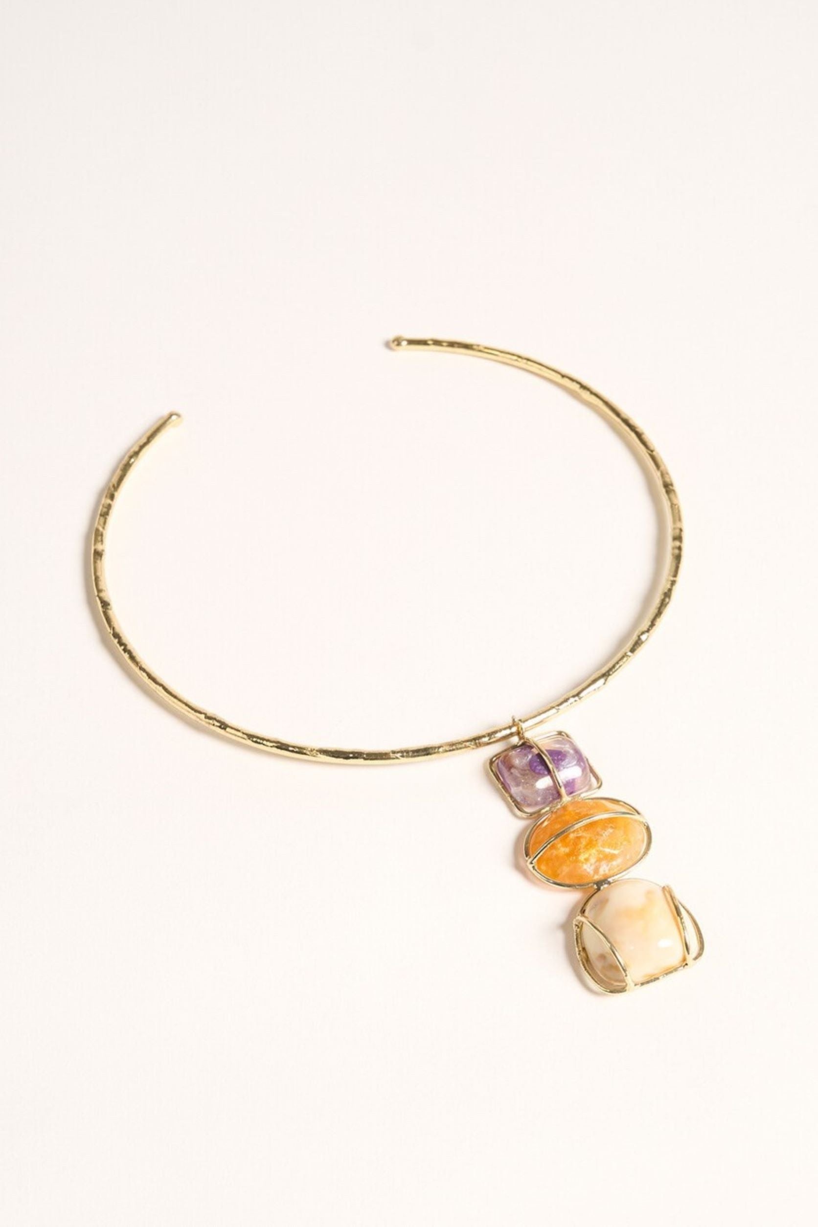 O colar Grace é uma gargantilha rígida e ajustável com um pingente adornado com pedras incrustadas. O seu estilo étnico e elegante evoca o verão — uma escolha perfeita para almas nostálgicas, mesmo no outono ou inverno. Ideal para usar com um decote em V para realçar o decote.