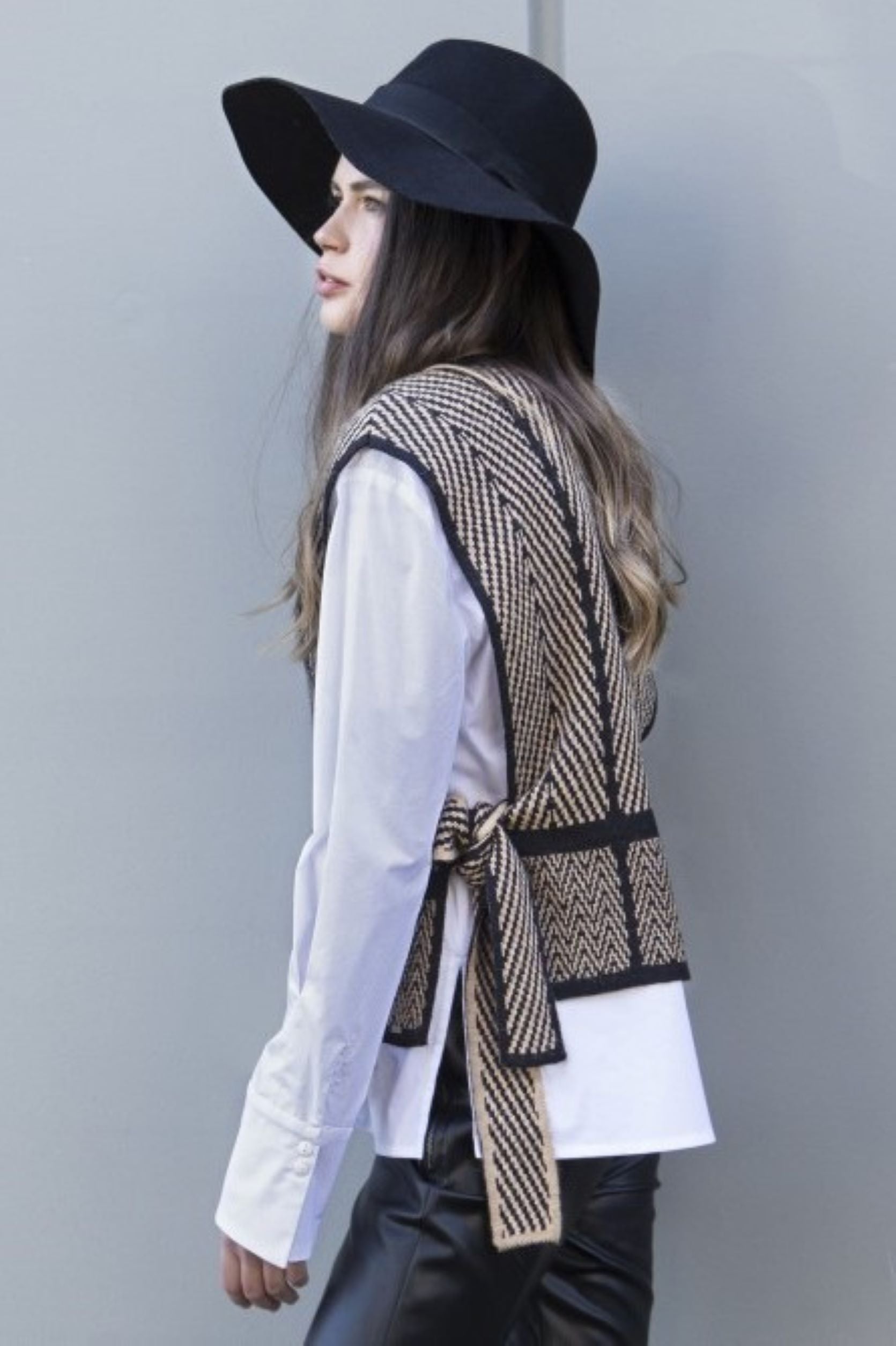 Colete preto e camel, com padrão zigzag. Aperta nas laterias.
