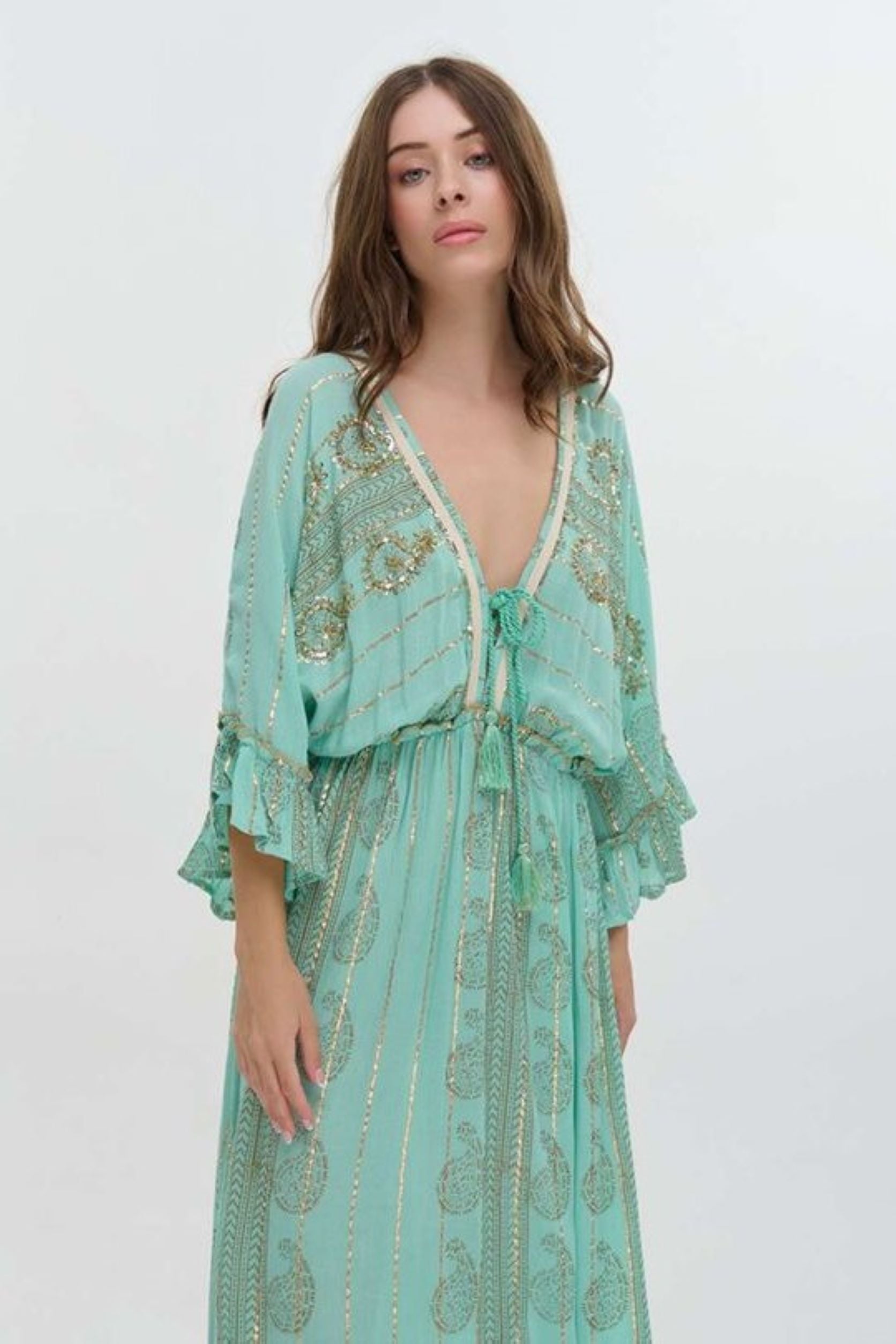 Vestido longo com mangas compridas na cor turquesa e com pormenores dourados.