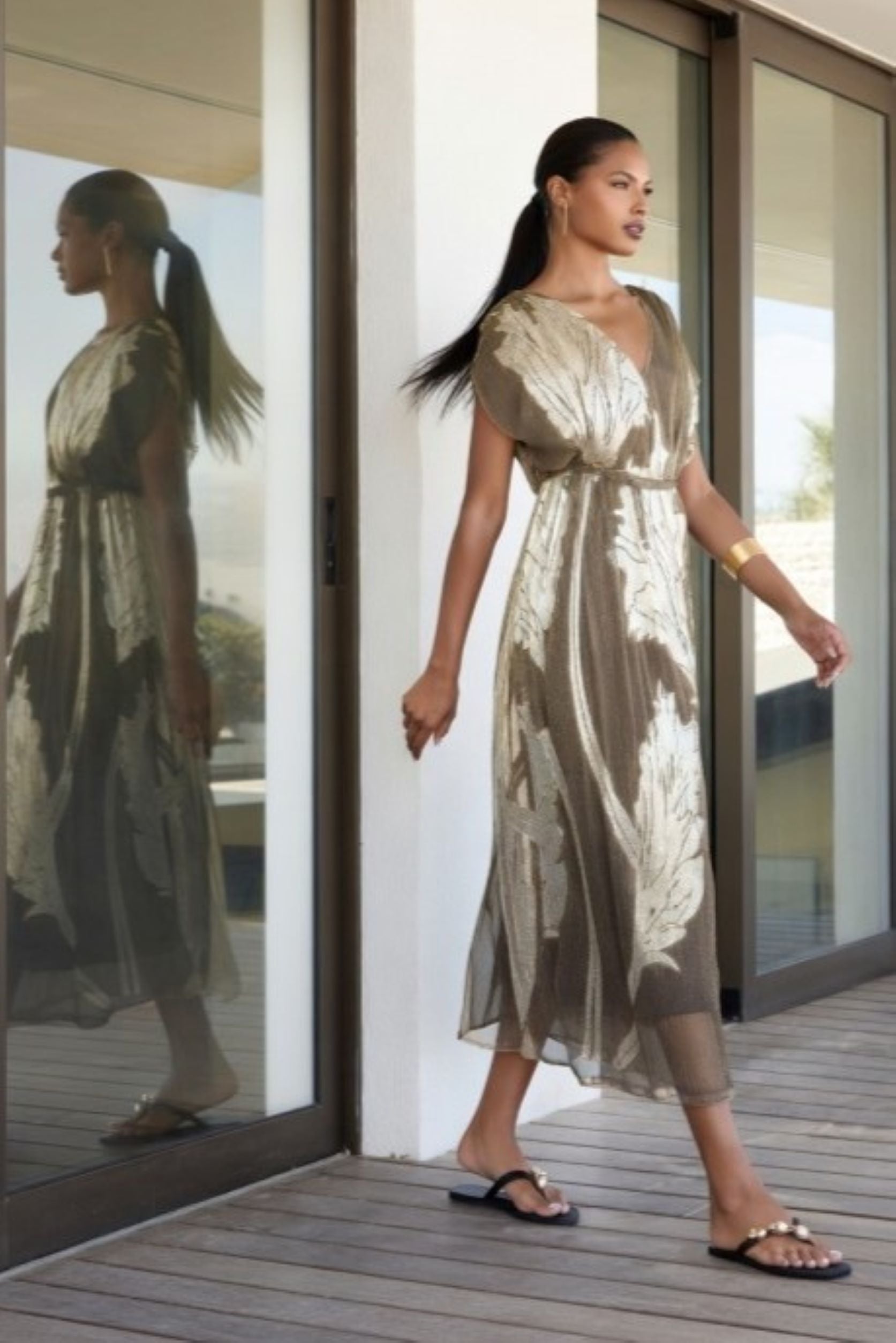 Vestido midi plissado metalizado e com detalhes em malha.
