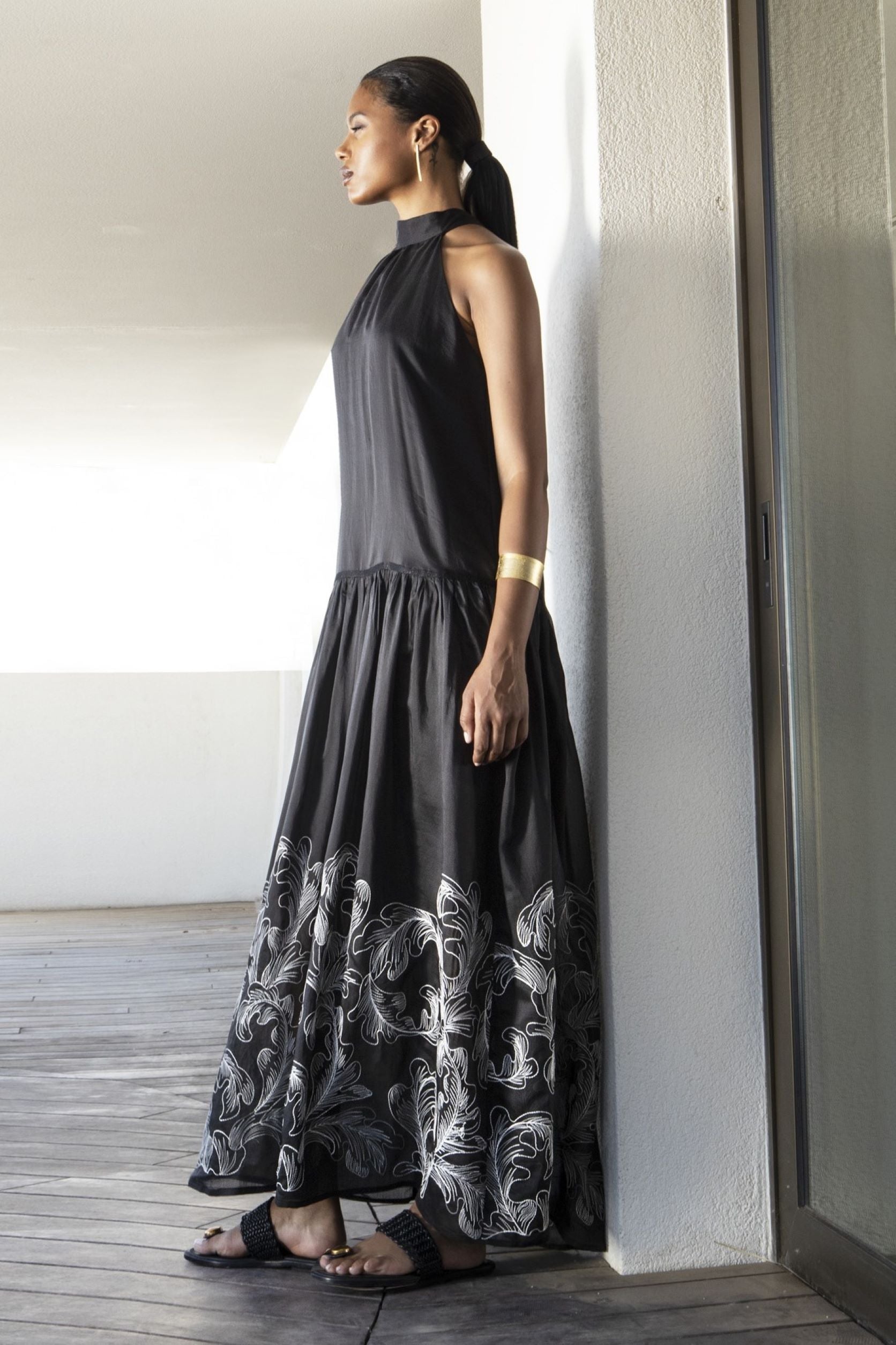 Vestido maxi bordado com detalhes em malha.
